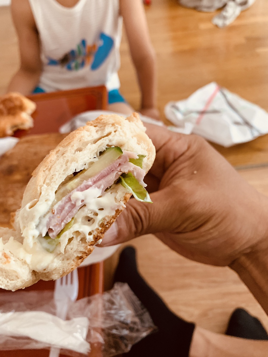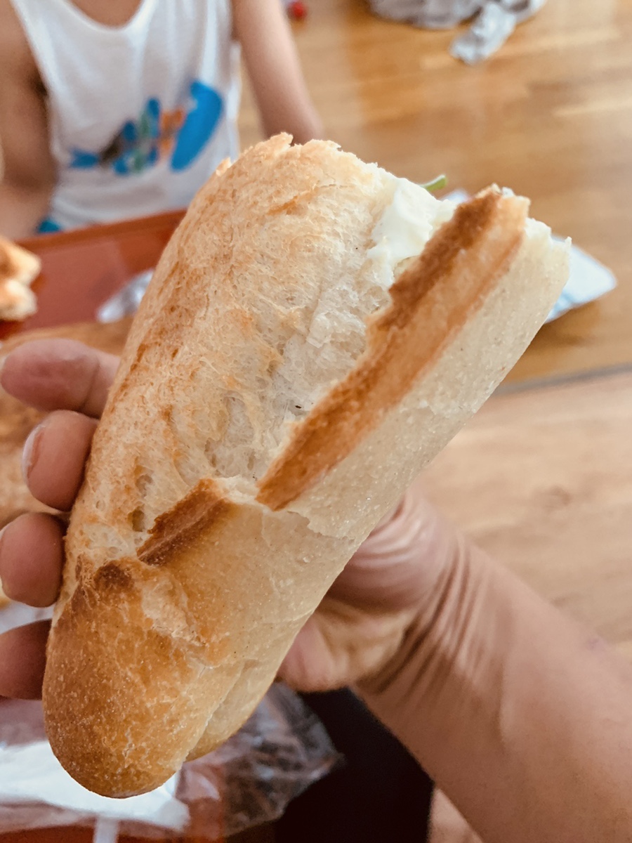 숙소에 들어와 아이와 함께 빵을 먹자고 하니... 아이는 밥을 달라고 하네요. 빵이 지겹다고;;; 진정한 한국인이네요. 프랑스에 왔으면 빵으로 아침을 해결해야지 대략난감!!! 사진으로는 작게 보이는 이 맘모스빵은 겉은 바삭 속은 부드럽고 안내 시금치 같은 베트남에서 먹었던 고수의 향이 약간씩 났는데... 고수를 좋아하는 나로서 맛있게 먹었던 빵이네요. 그다음으로 먹었던 바게트~ 그래서 이걸 나 혼자서 맛있게 먹는데...... 타르트는 너무 느끼해서 페스~ 바게트에 햄, 마요네즈, 샐러드 약간 들어있는데 은근히 맛있더군요.
