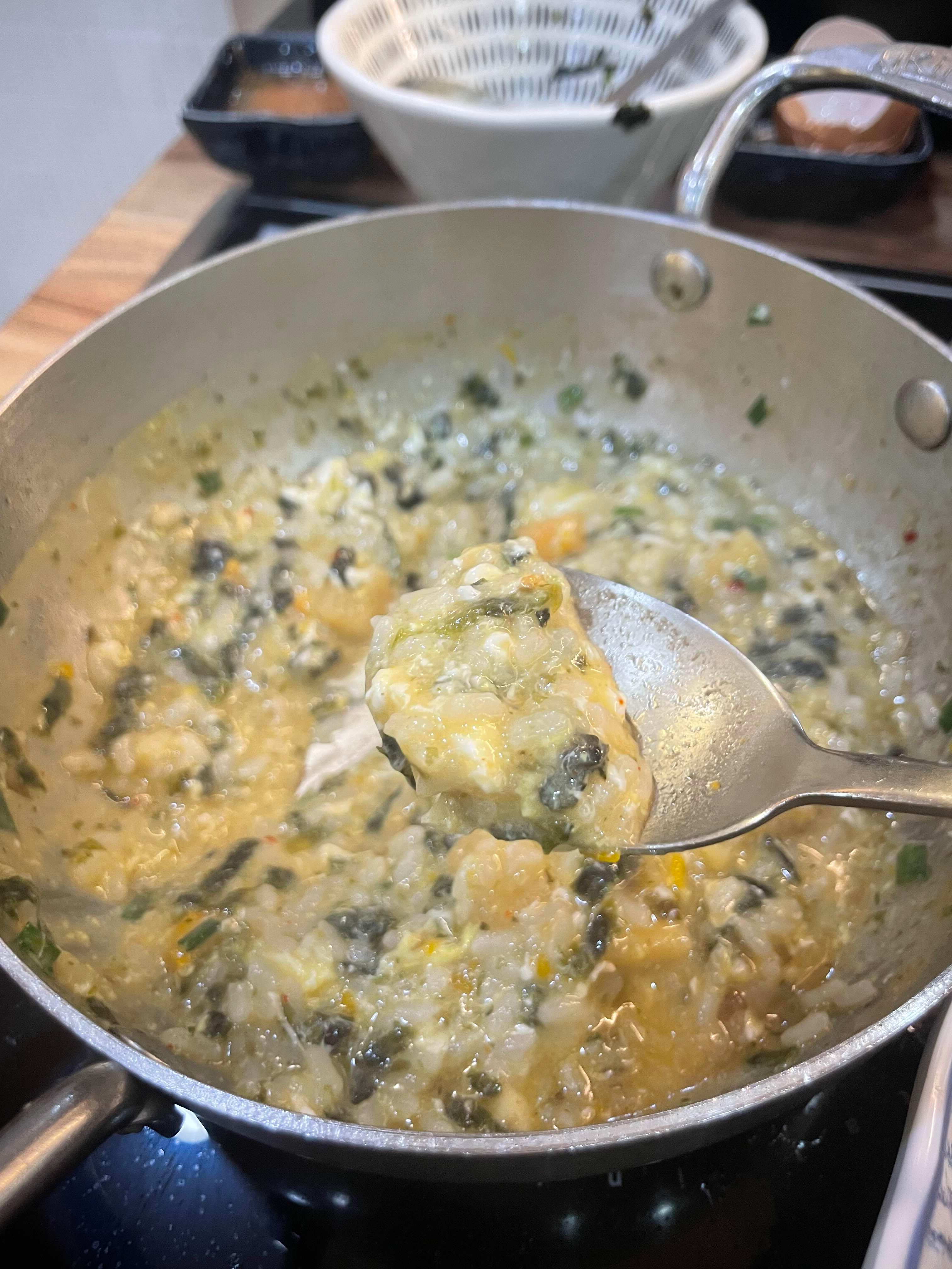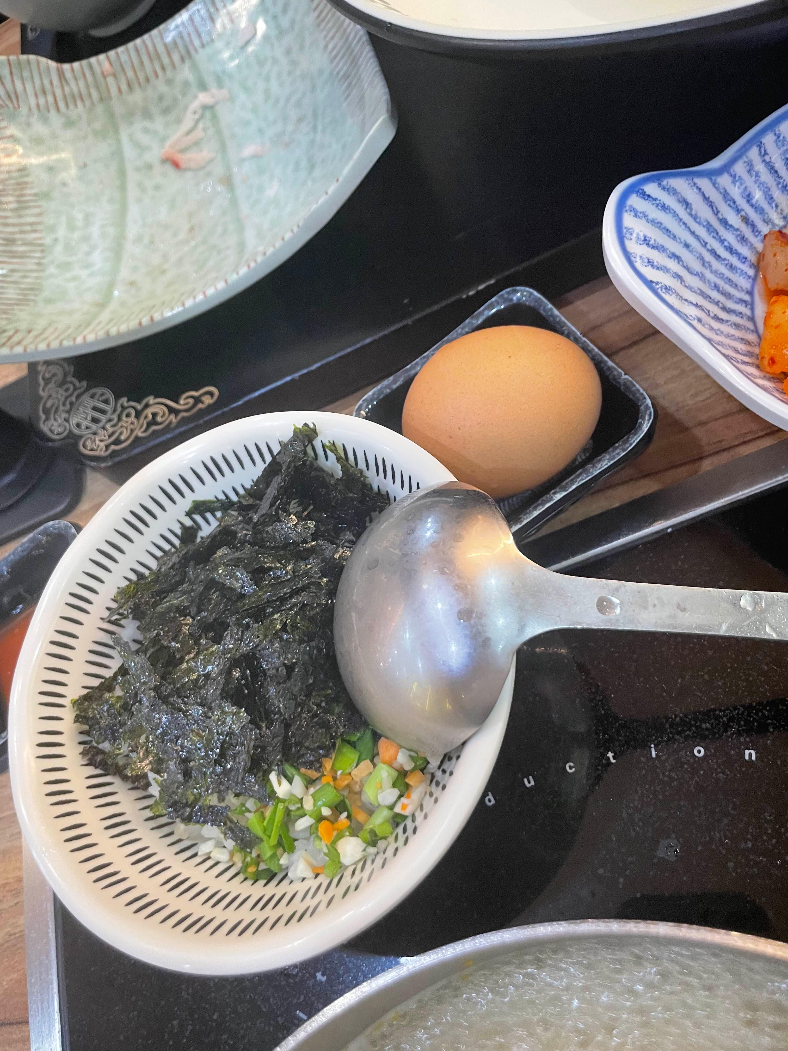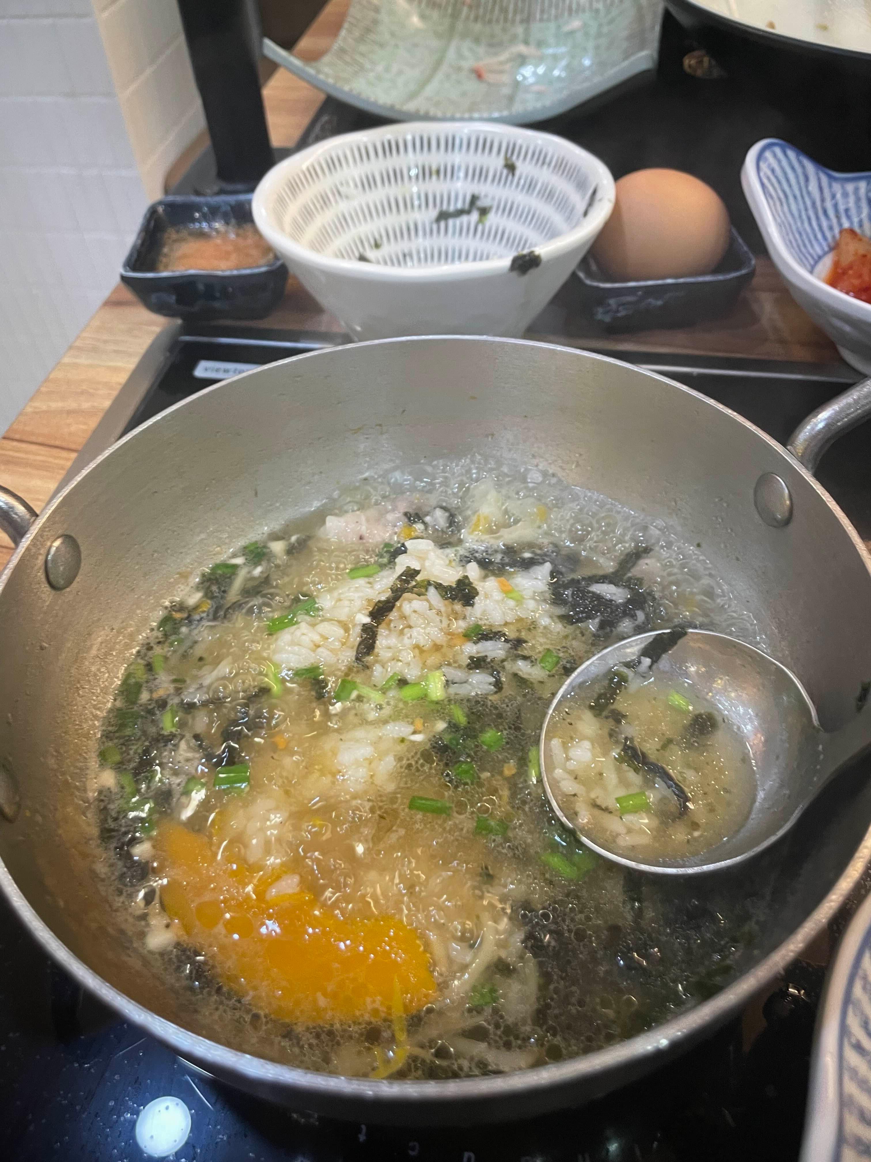 죽이 어느정도 익으면, 열을 낮추어서... 달걀 투하!!ㅎㅎ
