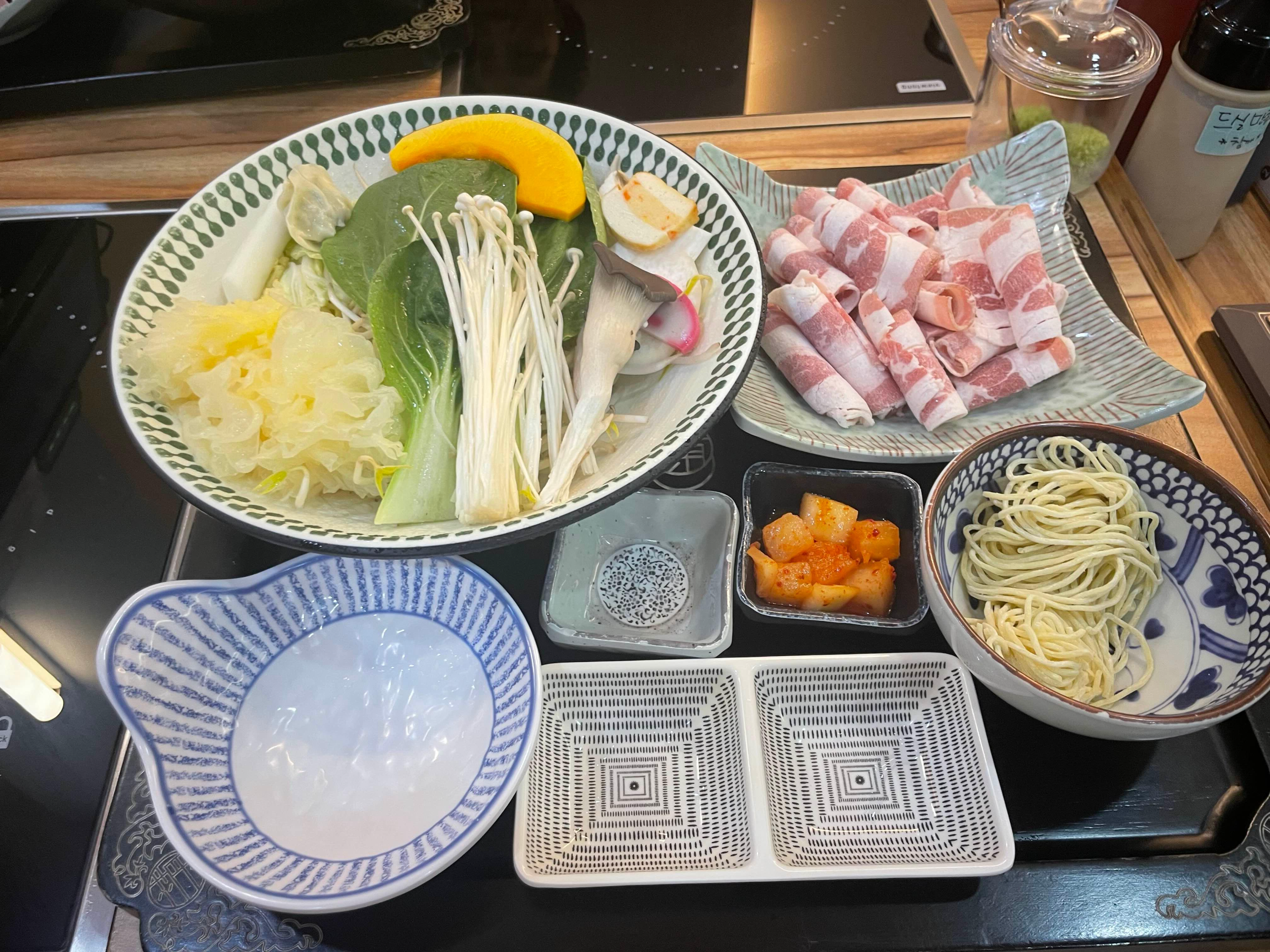 개인 육수 냄비와 샤브채소 그리고, 우삼겹이 나왔습니다. 기본 면사리도!!