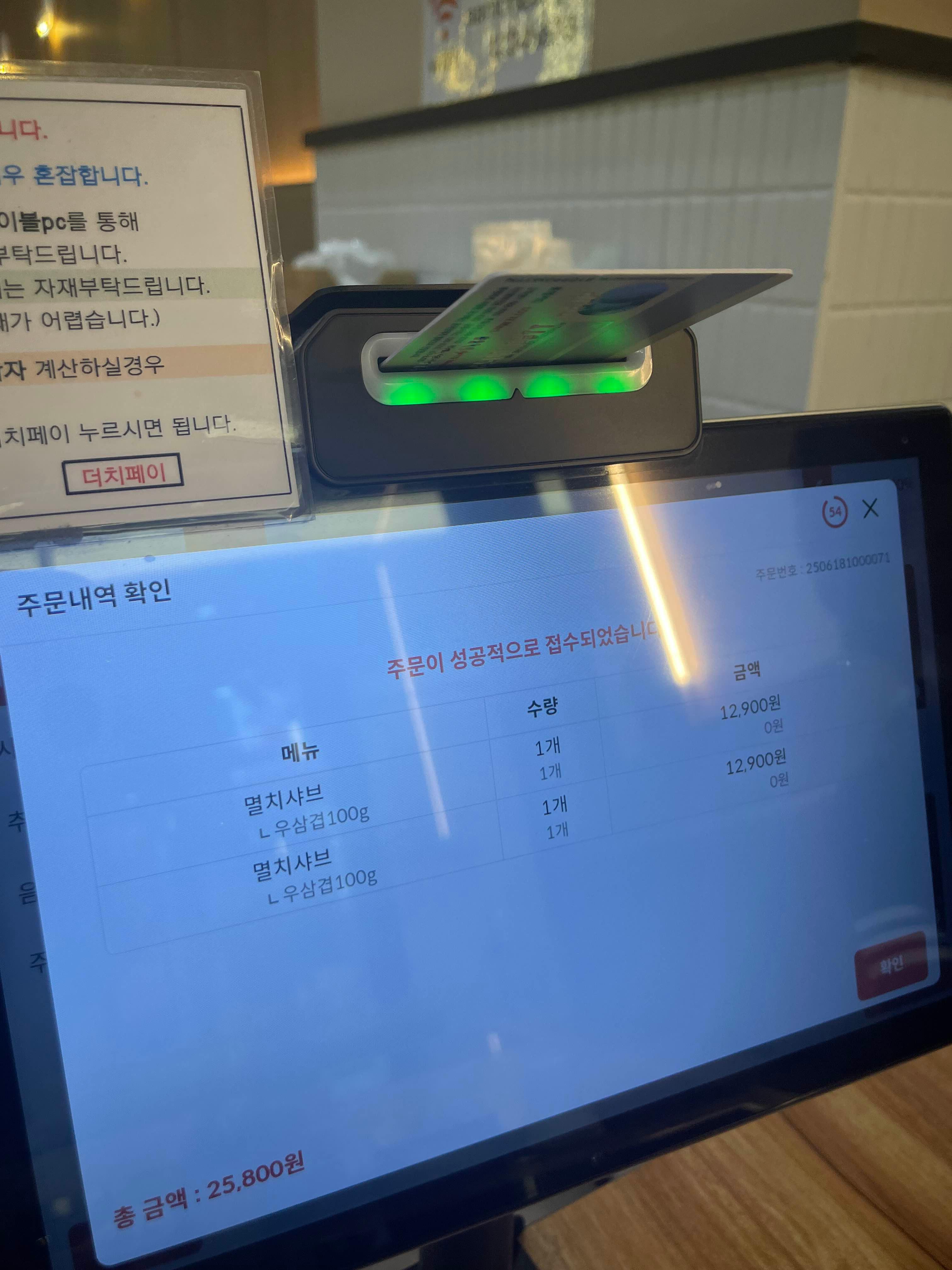 테이블에 있는 키오스크로 기본 메뉴로 하나씩 주문해 보았습니다. 가격은 12,900원!