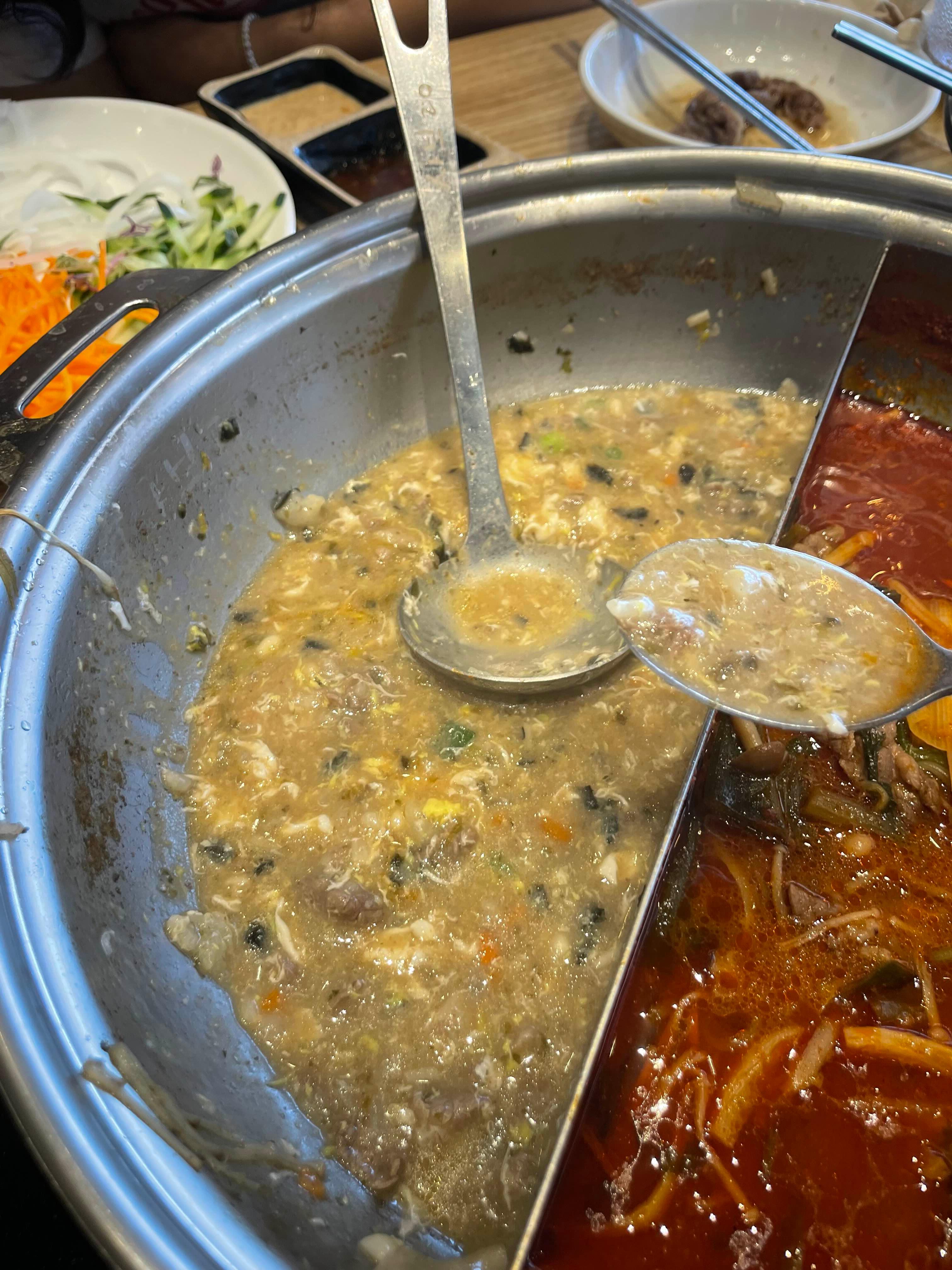 육수는 반반 그릇이라.... 기본으로 많이 주문한다는 맑은 육수와 매운 육수 반반으로 주문했습니다.