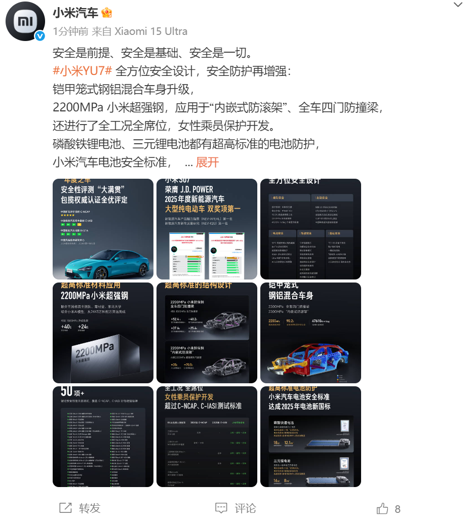 샤오미 YU7은 전방위 안전 설계와 강화된 안전 보호 기능을 갖추고 있습니다. 강화된 케이지 강철-알루미늄 하이브리드 차체가 업그레이드되었고, 2200 MPa 샤오미 초강력 강철이 "임베디드 롤 케이지"와 차량 전체의 4 도어 충돌 방지 빔에 사용되었으며, 여성 탑승자를 위한 풀 컨디션 및 풀 시트 보호 기능도 개발되었습니다. 리튬 인산철 배터리와 삼원 리튬 배터리는 초고성능 배터리 보호 기능을 갖추고 있습니다. 샤오미 자동차 배터리 안전 기준은 2025년 새로운 배터리 국가 표준을 달성했습니다!