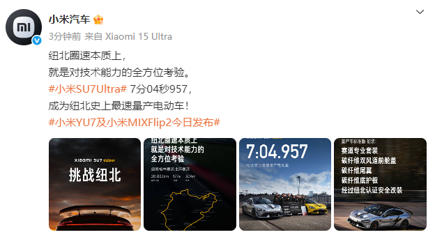 샤오미 모터스는 26일 저녁, #小米SU7Ultra# 7분 04초 957을 기록하며 뉘르부르크링 역사상 가장 빠른 양산형 전기자동차가 됐습니다!