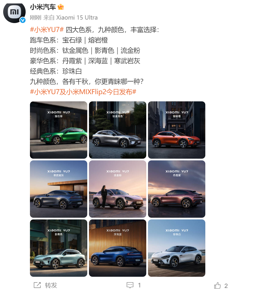 샤오미 YU7은 4가지 주요 컬러 시리즈와 9가지 색상을 선보이며, 풍부한 선택권을 제공합니다. 스포츠카 컬러 시리즈: 사파이어 그린, 라바 오렌지; 패션 컬러 시리즈: 티타늄 메탈릭, 섀도 블루, 플로잉 골드 파우더; 럭셔리 컬러 시리즈: 단샤 퍼플, 딥씨 블루, 캠브리안 그레이; 클래식 컬러 시리즈: 펄 화이트.
