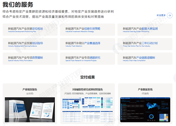 중국 산업을 더욱 깊이 이해하는 과학기술 의사결정 싱크탱크인 미래산업연구소는 최초로 "신에너지자동차산업계획연구소"를 설립하여 " 산업 연구 + 빅데이터 + 기술 통찰력 + 사전 투자 자원"이라는 고유한 산업 계획 서비스의 특징을 최대한 활용하여 지방 정부에 과학적이고 미래지향적이며 더욱 실용적인 산업 계획 컨설팅 솔루션을 제공하고자 합니다. 산업 계획, 투자 유치, 단지 조성, 프로젝트 운영 등 종합적인 서비스를 제공할 뿐만 아니라, 해양 경제 산업 데이터의 대형 화면 모니터링, 산업 체인 지도 작성, 특별 정책 수립 및 교육 지침 제공 등도 담당합니다.