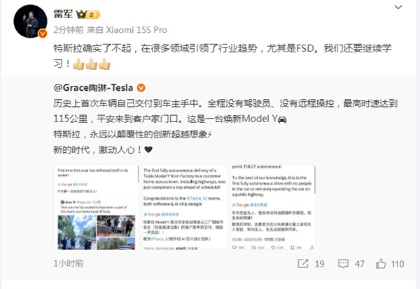 6월 28일, 샤오미 모터스 창립자 레이쥔은 테슬라 부사장 타오린의 웨이보 게시물을 리트윗했습니다. 그는 테슬라의 FSD(완전 자율주행) 기술을 공개적으로 칭찬하며 " 테슬라는 정말 놀랍고, 특히 FSD 분야에서 여러 분야에서 업계 트렌드를 선도해 왔습니다 . 우리는 아직 배울 것이 많습니다 ."라고 썼습니다. 그는 또한 블로그 게시물 마지막에 엄지 세 개를 치켜세웠습니다.