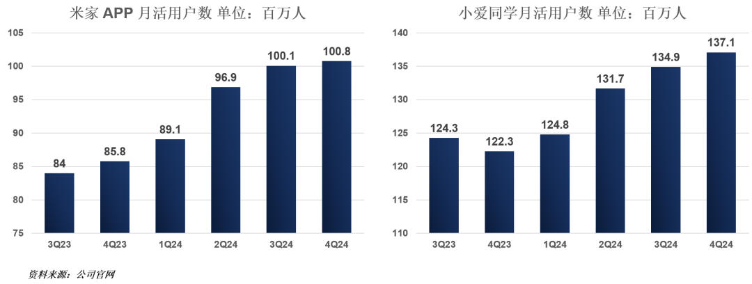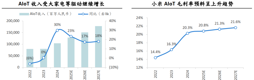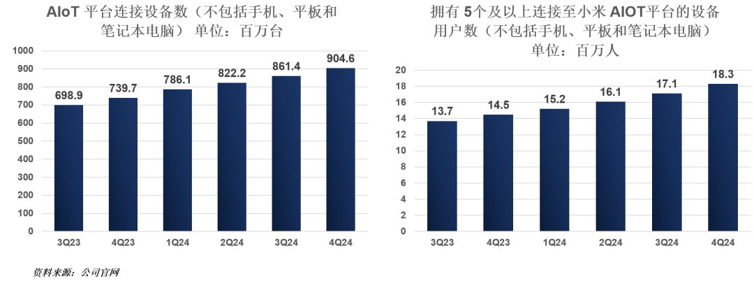 샤오미의 AIoT 플랫폼은 2024년 1,041억 위안의 매출을 창출할 것으로 예상되며, 팔찌와 스마트 냉장고와 같은 "고수익 제품"에 주력할 것입니다 . 더욱이, 이 네트워크에는 9억 대의 기기(휴대폰과 컴퓨터 제외)가 연결되어 있으며, 1,800만 명이 집에 최소 5대의 샤오미 스마트 가전을 보유하고 있습니다(스마트 가전 편의점을 여는 것과 같은 수준). 1억 명이 매일 Mi Home 앱을 "마스터 리모컨"으로 사용하고, 1억 3천만 명이 샤오아이를 집사로 사용합니다. 이러한 생태적 침투는 일반 가정을 "미래형 체험 공간"으로 탈바꿈시킵니다.