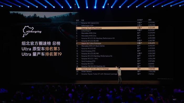 샤오미 기자 간담회에서 레이쥔은 또한 뉘르부르크링에서 진행된 샤오미 SU7 Ultra 프로토타입 차량의 최신 결과를 발표했습니다.