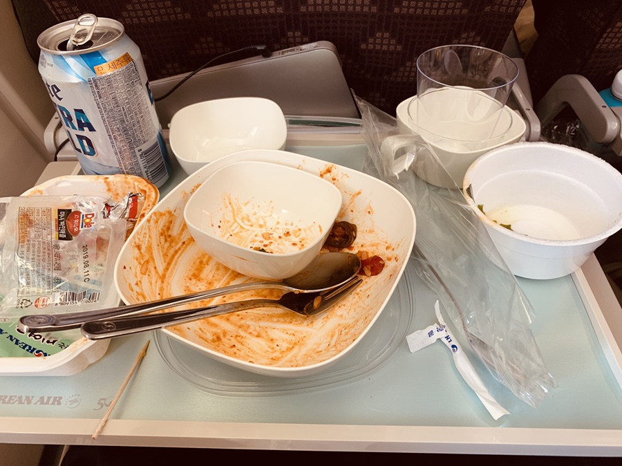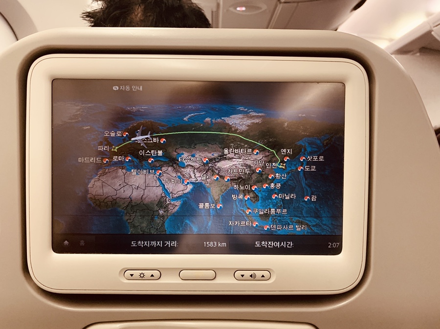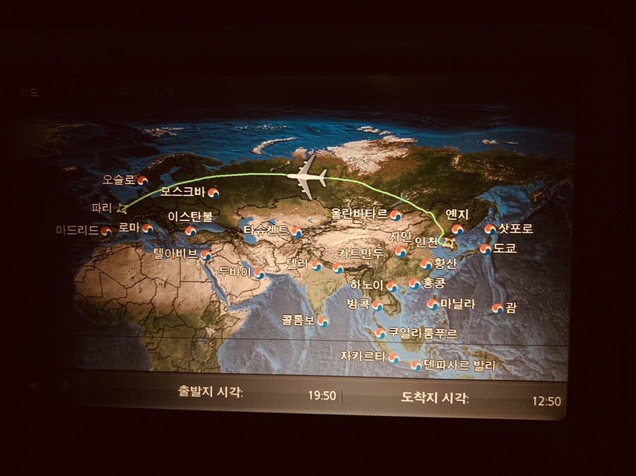 2번에 걸쳐 기내식을 모두 먹어주니 프랑스 파리에 거의 도착해 있었네요. 프랑스 운항시간이 12시간.... 이 지루한 시간을 지루하지 않게 보내는 것은.... 뭐니 뭐니 해도 먹고 자고, 먹고 자고입니다. 기내식에서 가장 맛있게 먹었던 음식은 비빔밥과 낚지 덮밥이네요. 한국인의 입맛에는 역시 매콤한 소스가 필요하네요^^