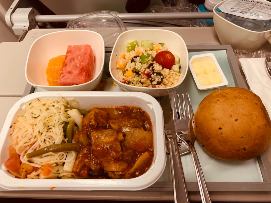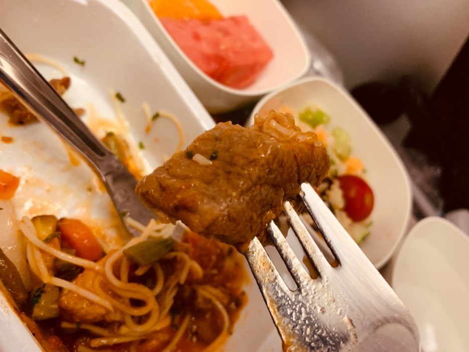 프랑스에 거의 도착할? 시간에 한 번 더 기내식이 나오는데... 소고기 파스타를 주문했습니다. 프랑스의 느끼한 음식에 적응이 필요할 것 같아서 파스타 주문했는데... 파스타 보다, 날치알이 들어있는 샐러드가 더 맛있더군요. 파스타의 소고기가 큼지막하게 들어있어서 그 부분도 맛 있었네요.ㅎㅎ 곁들이로 나온 빵은 버터에 발라서 먹어주니.... 프랑스 편 기내에서 프랑스 음식 적응이 완료된 기분이네요.