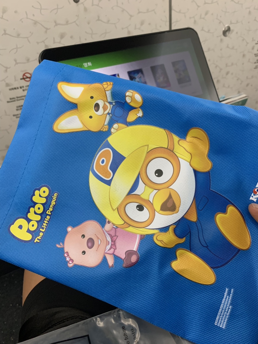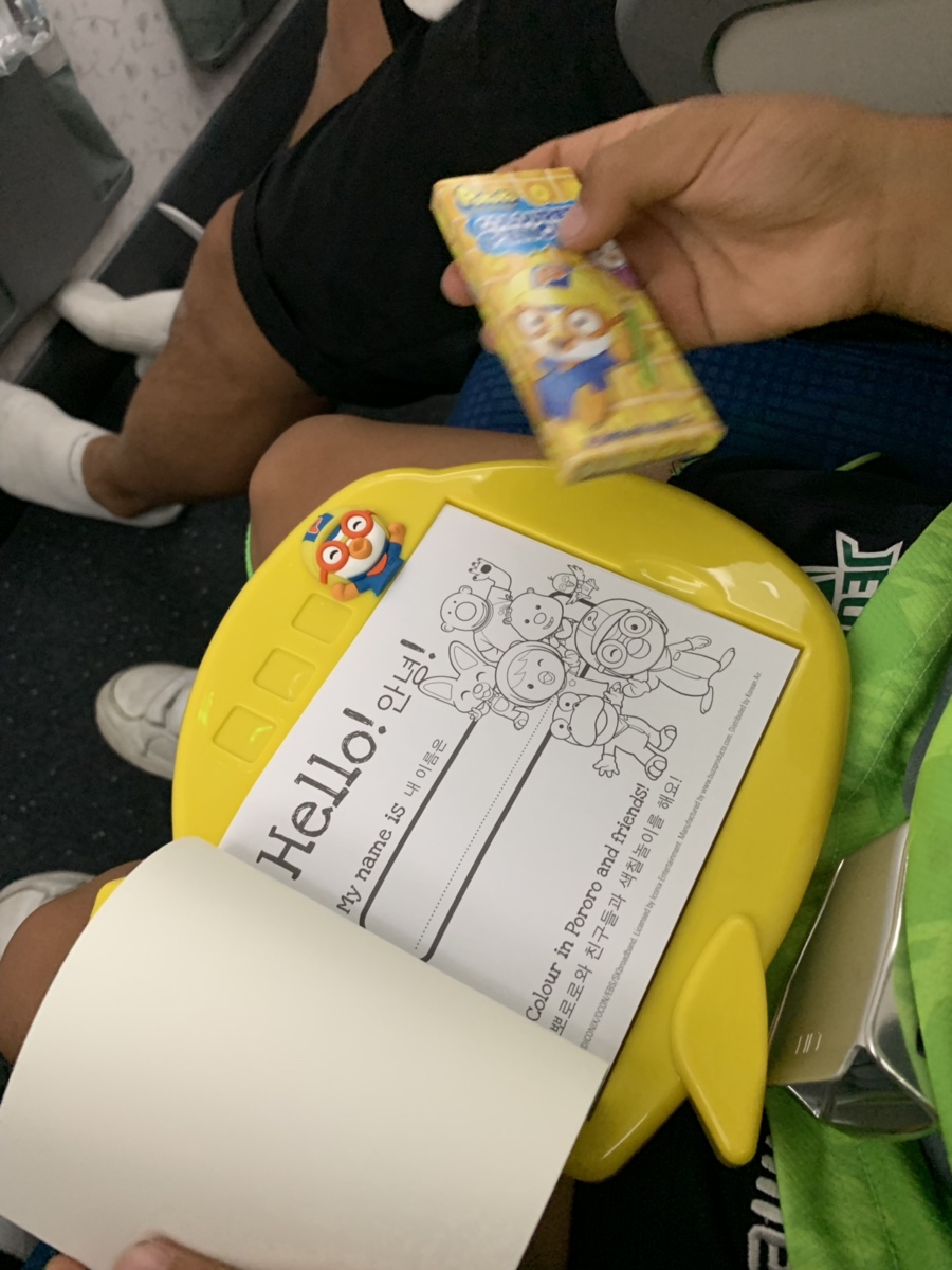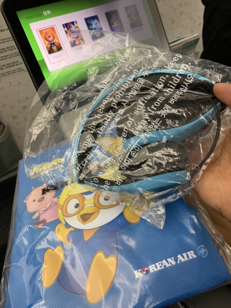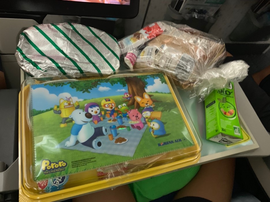 아이와 함께 탑승하면 아이들이 비행 중 심심하지 않게 "뽀로로 색칠놀이"를 하나씩 나누어 주네요. 우리 아이는 색칠놀이하기에는 너무 커서.... 동생 주겠다고 챙기라고 하네요. 그래서 뽀로로 색칠놀이는 동생 프랑스 여행 선물이 되었답니다. 항공기 이륙 후 예약했던 아동식부터 가져다주더군요. 처음에 나온 아동식은 피자~ 피자는 은박지로 덮여있고, 뽀로로 커버에 있는 음식은 빵, 파스타 비슷한 음식이 들어있더군요. 아이는 프랑스에서 이미 빵을 많이 먹었다고.... 미역국과 매콤한 음식을 먹는다고 하네요;;; 그래서 내 기내식은 비빔밥으로 주문~^^ 아동식에서 아이가 가장 좋아했던 부분은...... 함께 나왔던 과자봉지^^