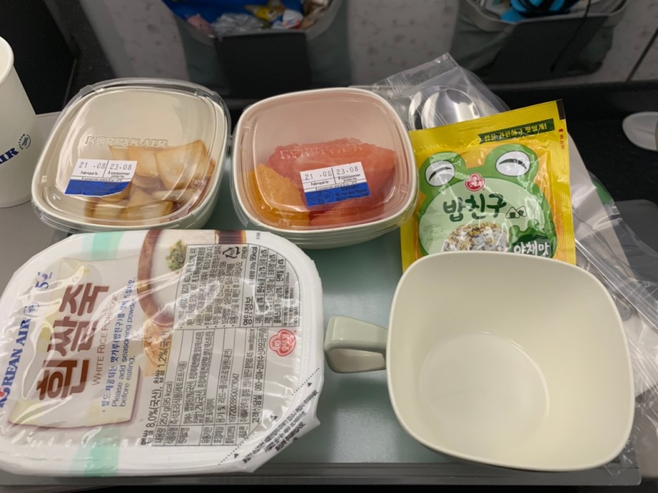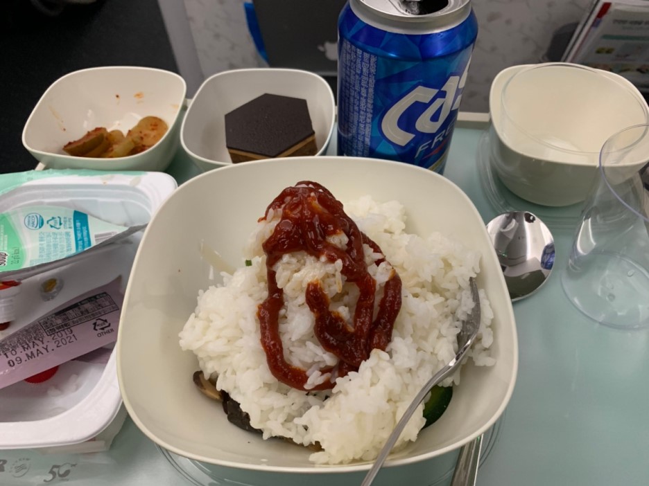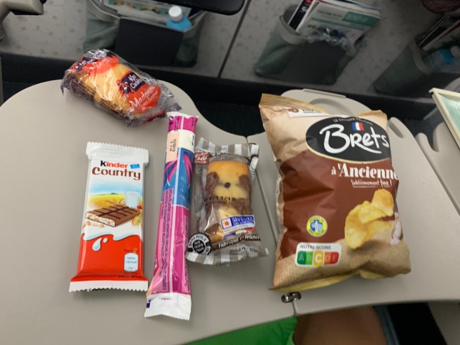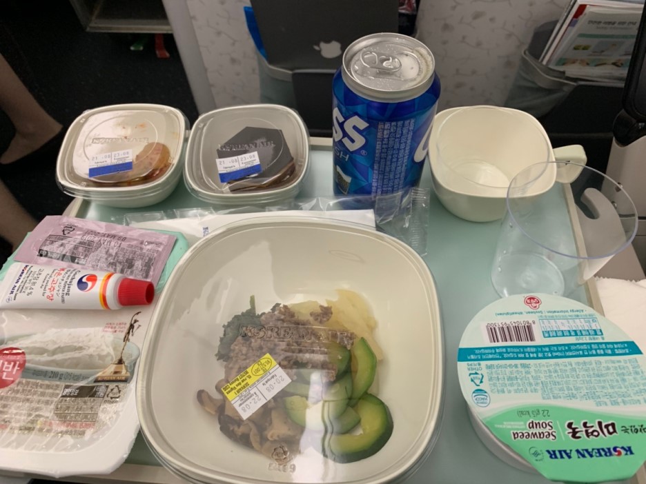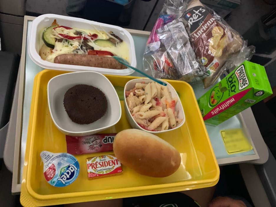 여기까지 아이와 함께 먹었던 기내식(피자, 핫도그, 비빔밥, 야채죽)입니다. 이 중에서 가장 맛있게 먹었던 기내식은 당연 비빔밥~^^ 프랑스에서 복귀하는 피행 편이라 여행 중 느끼했던 프랑스 음식에서 해방? 시켜주는 기내식이었네요. 아래는 한국에서 프랑스 편 기내식입니다.