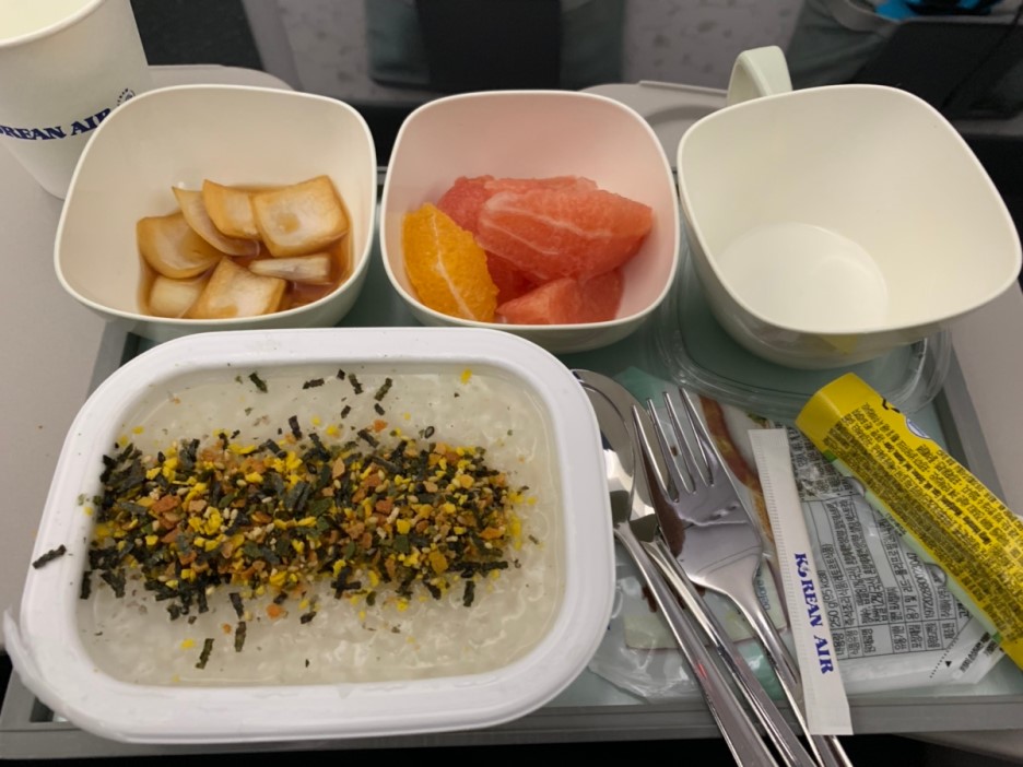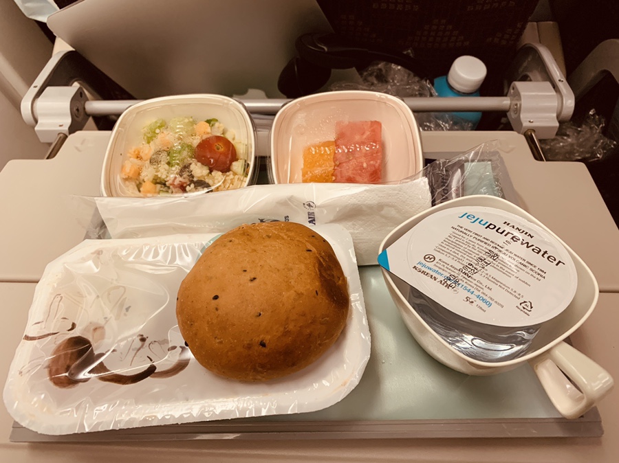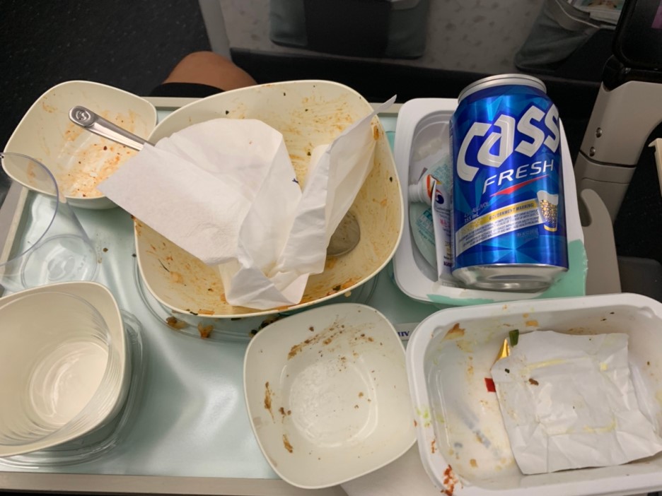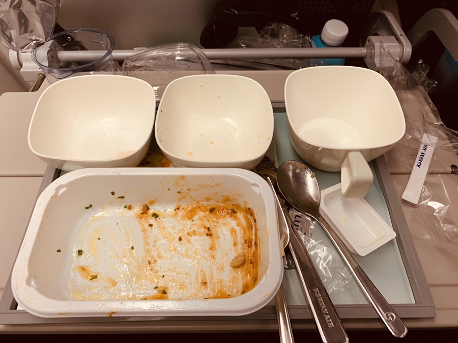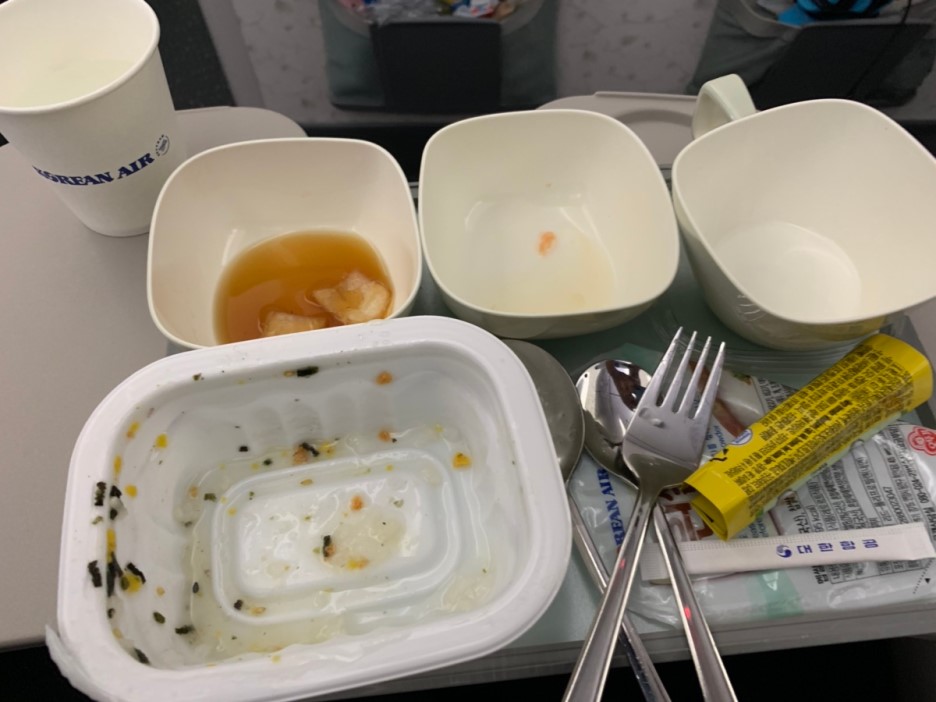 여기까지 아이와 함께 먹었던 기내식(피자, 핫도그, 비빔밥, 야채죽)입니다. 이 중에서 가장 맛있게 먹었던 기내식은 당연 비빔밥~^^ 프랑스에서 복귀하는 피행 편이라 여행 중 느끼했던 프랑스 음식에서 해방? 시켜주는 기내식이었네요. 아래는 한국에서 프랑스 편 기내식입니다.