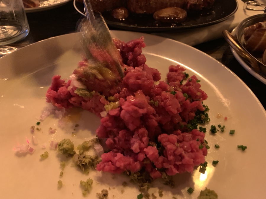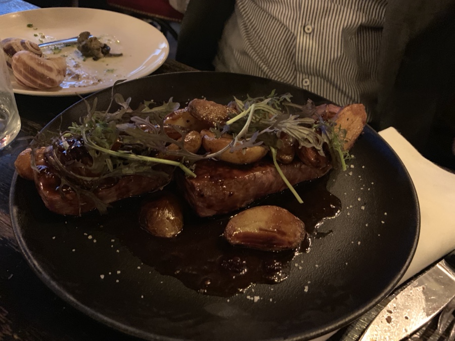 달팽이를 와인과 함께 맛있게 있는데... 프랑스에서 맛볼 수 있다는 푸아그라(거위 간)이 나왔네요. 거위 간의 식감은 거의 못 느껴지더군요. 돼지 간은 좀 시간이 지나면 퍽퍽한 느낌인데, 푸아그라는 약간 덜 익힌 느낌이랄까? 입안에서 녹는 느낌이네요. 함께 나온 빵과 곁드려 먹기에 좋을 거 같은데... 달팽이만큼 맛있지는 않았네요. 프랑스까지 왔으니 한 번 정도 맛보기에 좋은 음식이네요^^ 그리고 연달아 나오는 음식들은 스테이크 29유로(38,000원), 쇠고리 타르타르 22유로(29,000원) 치킨요리 25유로(33,000원)가 줄줄이 나오네요. 3가지 음식 중에 스테이크가 가장 맛있더군요.