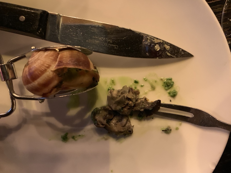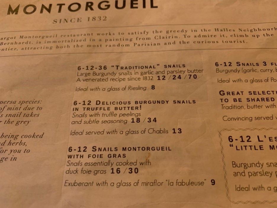 메뉴판에 가계가 1832년부터 운영된 프랑스에서 상당히 오래된 식당입니다. 프랑스 지인 따라 프랑스 전통요리? 달팽이를 맛보기 위해 방문한 식당입니다. 우선 달팽이를 먹기 위해 방문했으니... 달팽이 기본을 맛보기 위해 전통 달팽이 6개 12유로(15,000원)와 약간 변형한 달팽이 6개 18유로(23,000원) 하나씩 주문했습니다. 그리고 프랑스에서 맛볼 수 있다는 푸아그라(거위 간)도 주문했네요. 그 외 스테이크, 소고기 타르타르, 와인도 한 병 주문했습니다.