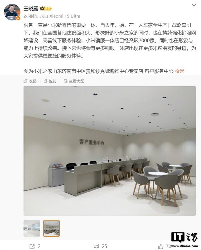 [#샤오미 판매 및 서비스 통합 매장 2,000개 돌파, 올해 소매 매장 2만 개 돌파 예상] 7월 24일, 샤오미 그룹 수석 부사장 겸 중국 총재 왕샤오얀(Wang Xiaoyan)은 오늘 게시물을 통해 서비스가 샤오미의 새로운 소매업에서 중요한 부분을 차지해 왔다고 밝혔습니다. 작년부터 "사람, 자동차, 집의 완벽한 생태계"라는 전략 아래, 전국에 대규모의 매력적인 샤오미 홈(Xiaomi Homes)을 구축하는 동시에 판매 및 서비스 네트워크 구축을 강화하고 오프라인 서비스 경험을 개선해 왔습니다.