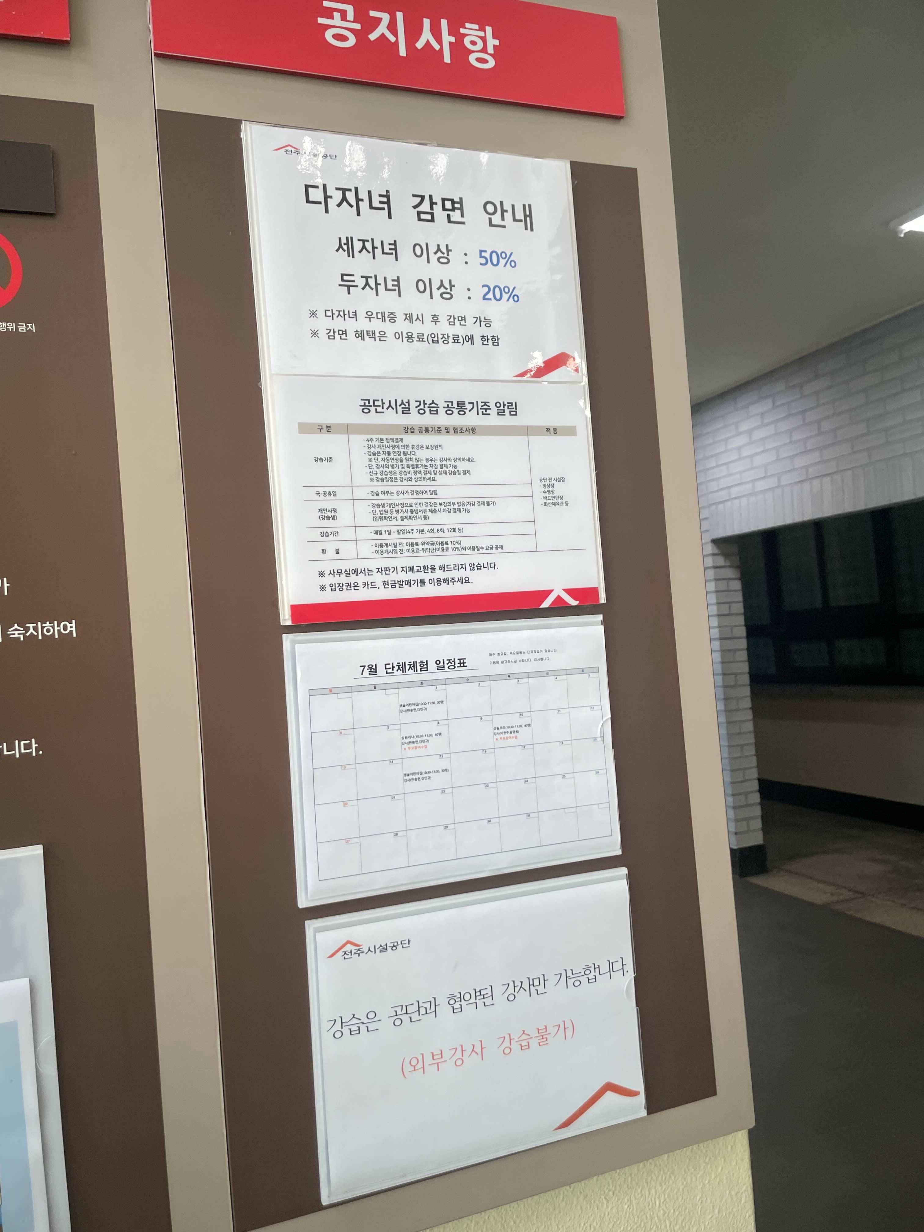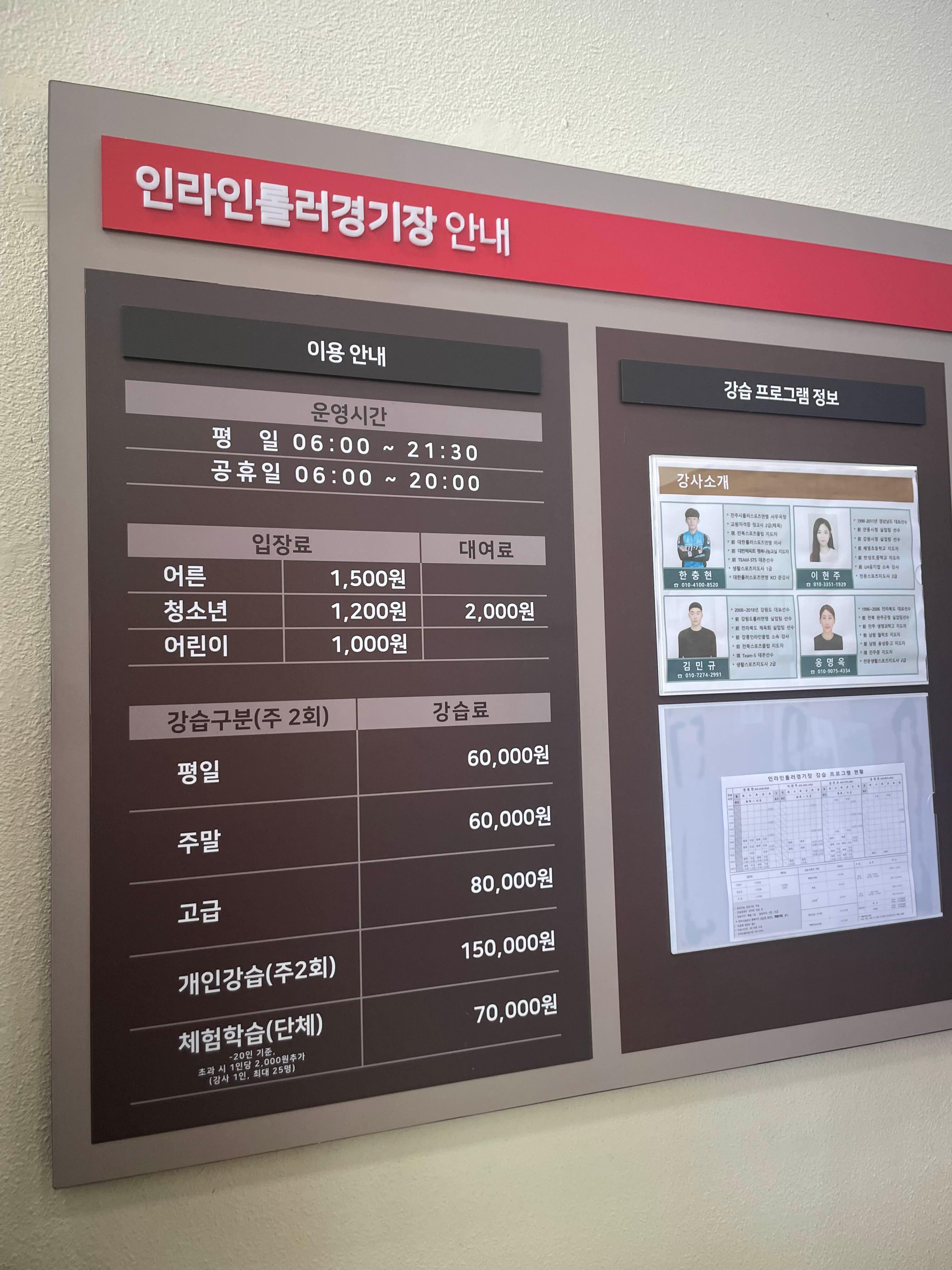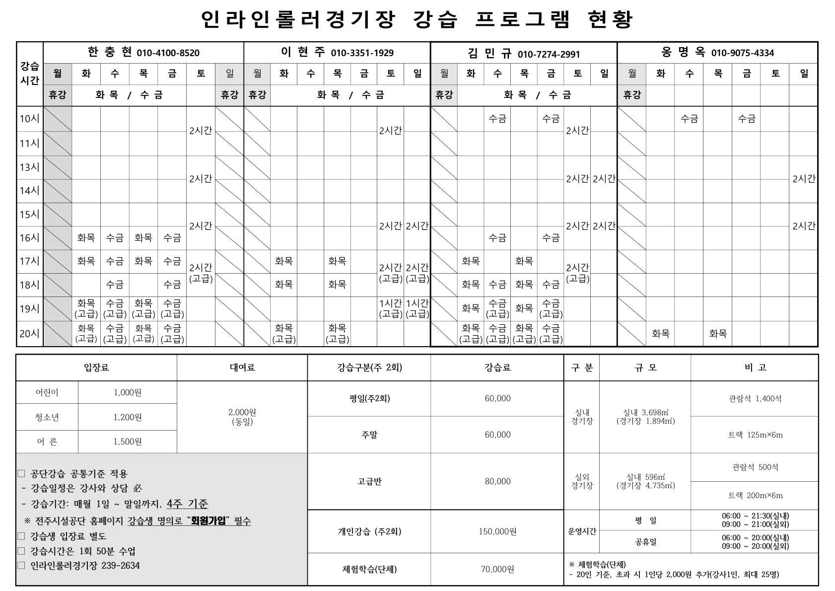 강습 정보 운영시간 평 일 : 06:00 ~ 21:30 주 말 : 06:00 ~ 20:00 연락처 : 063-239-2634 신청서 다운로드 이용료 및 사용료 체육경기 50,000원. 기타행사 100,000원(1회 8시간 - 단, 실외인라인경기장의 경우 시간