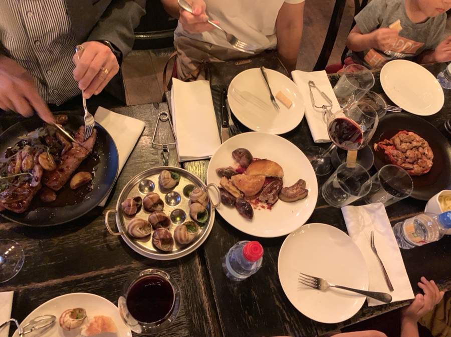 프랑스를 대표하는 음식이 바게트? 가 있지만 바게트 외 다양한 먹거리가 있죠. 오늘은 프랑스 파리 르 보르 박물관 근처에 위치한 달팽이 요리 전문점(L'Escargot Montorgueil)에 방문하였습니다. 달팽이 요리와 푸아그라(거위 간), 소고기 타르트(육회)를 주문하였고, 아이들용 스테이크, 치킨요리를 주문해 보았네요
