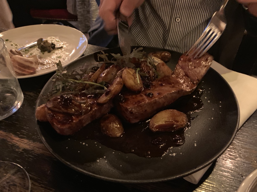 달팽이를 와인과 함께 맛있게 있는데... 프랑스에서 맛볼 수 있다는 푸아그라(거위 간)이 나왔네요. 거위 간의 식감은 거의 못 느껴지더군요. 돼지 간은 좀 시간이 지나면 퍽퍽한 느낌인데, 푸아그라는 약간 덜 익힌 느낌이랄까? 입안에서 녹는 느낌이네요. 함께 나온 빵과 곁드려 먹기에 좋을 거 같은데... 달팽이만큼 맛있지는 않았네요. 프랑스까지 왔으니 한 번 정도 맛보기에 좋은 음식이네요^^ 그리고 연달아 나오는 음식들은 스테이크 29유로(38,000원), 쇠고리 타르타르 22유로(29,000원) 치킨요리 25유로(33,000원)가 줄줄이 나오네요. 3가지 음식 중에 스테이크가 가장 맛있더군요.