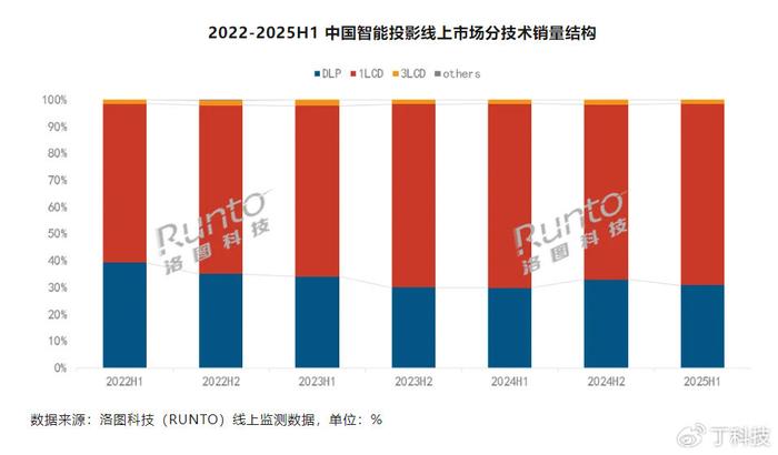 주요 스마트 프로젝터 기술 중 DLP와 1LCD 제품 모두 판매가 감소하고 있지만, 딩 테크놀로지(Ding Technology)는 1LCD 프로젝터 판매 감소폭이 더욱 크다고 지적합니다. 2025년 상반기 1LCD 기술의 온라인 시장 점유율은 67.8%로 전년 동기 대비 0.9%p 감소했으며, 매출은 전년 동기 대비 9.4% 감소했습니다. 같은 기간 DLP 기술의 온라인 시장 점유율은 30.8%로 전년 동기 대비 1.0%p 증가했지만, 매출은 여전히 전년 동기 대비 5% 감소했습니다.