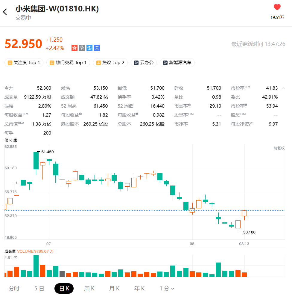 본 기사가 발행될 당시 샤오미의 주가는 52.95홍콩달러(현재 환율로 약 48.5위안)로 어제 대비 2.42% 상승했으며, 총 시가총액은 1조 3,800억 홍콩달러(현재 환율로 약 1조 2,600억 위안) 에 달했습니다 .