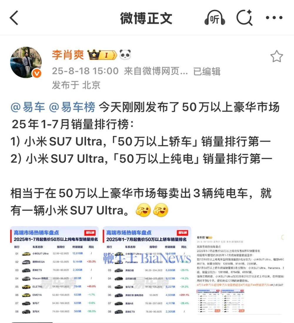 8월 18일, 샤오미 자동차 부사장 리샤오솽은 이처방이 1월부터 7월 25일까지 50만 위안 이상 가격대의 초호화차 시장 판매 순위를 발표했다는 게시물을 올렸습니다.