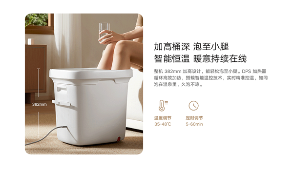 이 기기는 382mm 높이로 설계되어 종아리까지 물을 담글 수 있습니다. 온도는 35~48°C까지 조절 가능하며, 지능형 온도 조절 기술을 탑재하여 장시간 물에 담가도 춥지 않습니다.