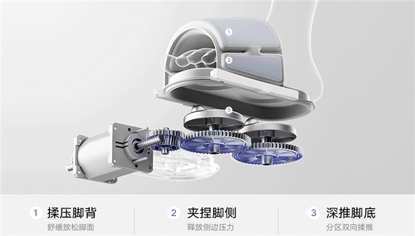 풋배스는 3차원 에어백 랩핑 디자인을 채택한 것으로 알려져 있습니다. 에어백은 발등과 옆면을 감싸 발 마사지 플레이트와 함께 3차원 마사지 시스템을 형성합니다. 에어백이 움직이면서 누르기-주무르기-꼬집기-이완-밀기 마사지 기법을 구현합니다.