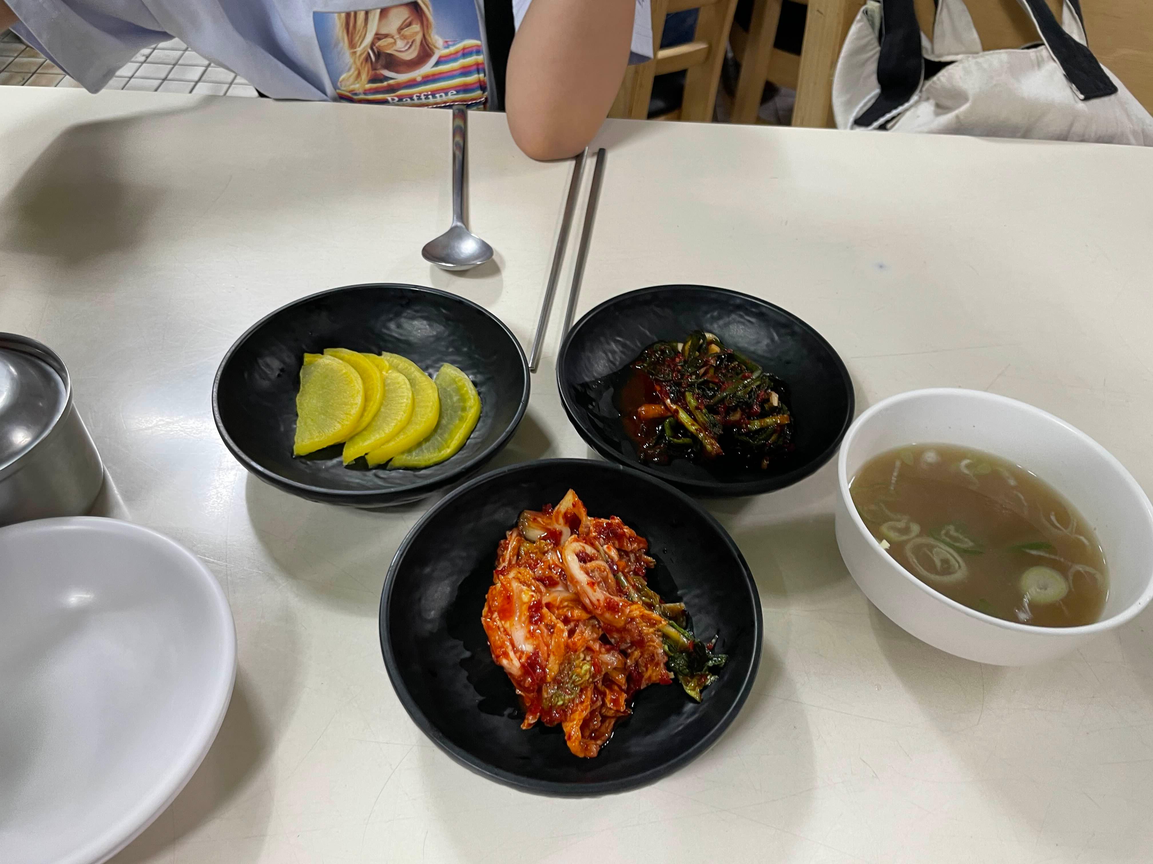 음식을 주문하니 밑반찬으로 단무지, 파김치, 배추김치~~