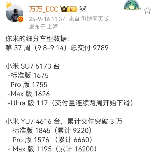 [CNMO 기술 뉴스] 9월 16일, 한 자동차 블로거가 37주차(9월 8일~14일) 샤오미 오토 모델의 판매량을 공개했습니다. 이 중 YU7 스탠다드 에디션은 1,845대를 판매하며 샤오미 모델 중 가장 많은 판매량을 기록했습니다.