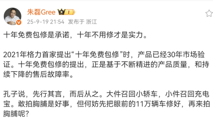 물론 다른 에어컨 브랜드들이 여전히 침묵하는 동안, 그리(Gree)는 샤오미의 새로운 보증 정책에 가장 먼저 대응했습니다. 생방송 후, 그리의 마케팅 이사 주레이(Zhu Lei)는 "10년 무상 수리는 약속이고, 10년 무상 수리는 강점입니다."라는 메시지를 게시했습니다.