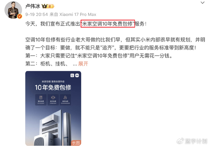 주요 뉴스를 라이브 스트리밍과 컨퍼런스를 통해 발표하는 것으로 유명한 샤오미가 9월 19일 라이브 스트리밍을 통해 중대 발표를 했습니다. 샤오미 그룹 수석 부사장 루 웨이빙은 올해 1월 1일 이후 설치된 약 750만 대의 샤오미 에어컨에 대한 "10년 무료 보증"을 공식 출시한다고 발표했습니다.
