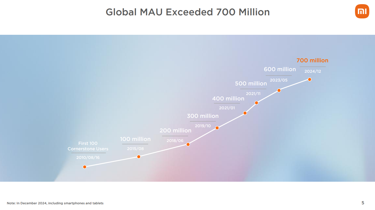 샤오미의 월간활성유저는 24년 말 기준 7억 명이 넘어섰습니다.