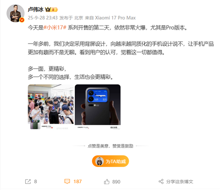 샤오미 Mi 17, Mi 17 Pro, Mi 17 Pro Max 모델이 최근 모든 채널에서 판매를 시작했습니다. 판매 시작 5분 만에 2025년 모든 가격대의 국내 신모델 휴대폰 첫날 판매량과 매출 기록을 경신했습니다. 루 웨이빙도 오늘 웨이보에 "샤오미 Mi 17 시리즈는 판매 2일 차에도 여전히 큰 인기를 누리고 있습니다!"라는 글을 올렸습니다.
