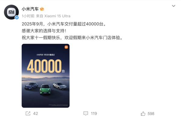 | 샤오미 모터스는 9월에 4만 대가 넘는 차량을 판매했으며, 연간 판매 목표는 35만 대입니다. (0) | 2025.10.01 |