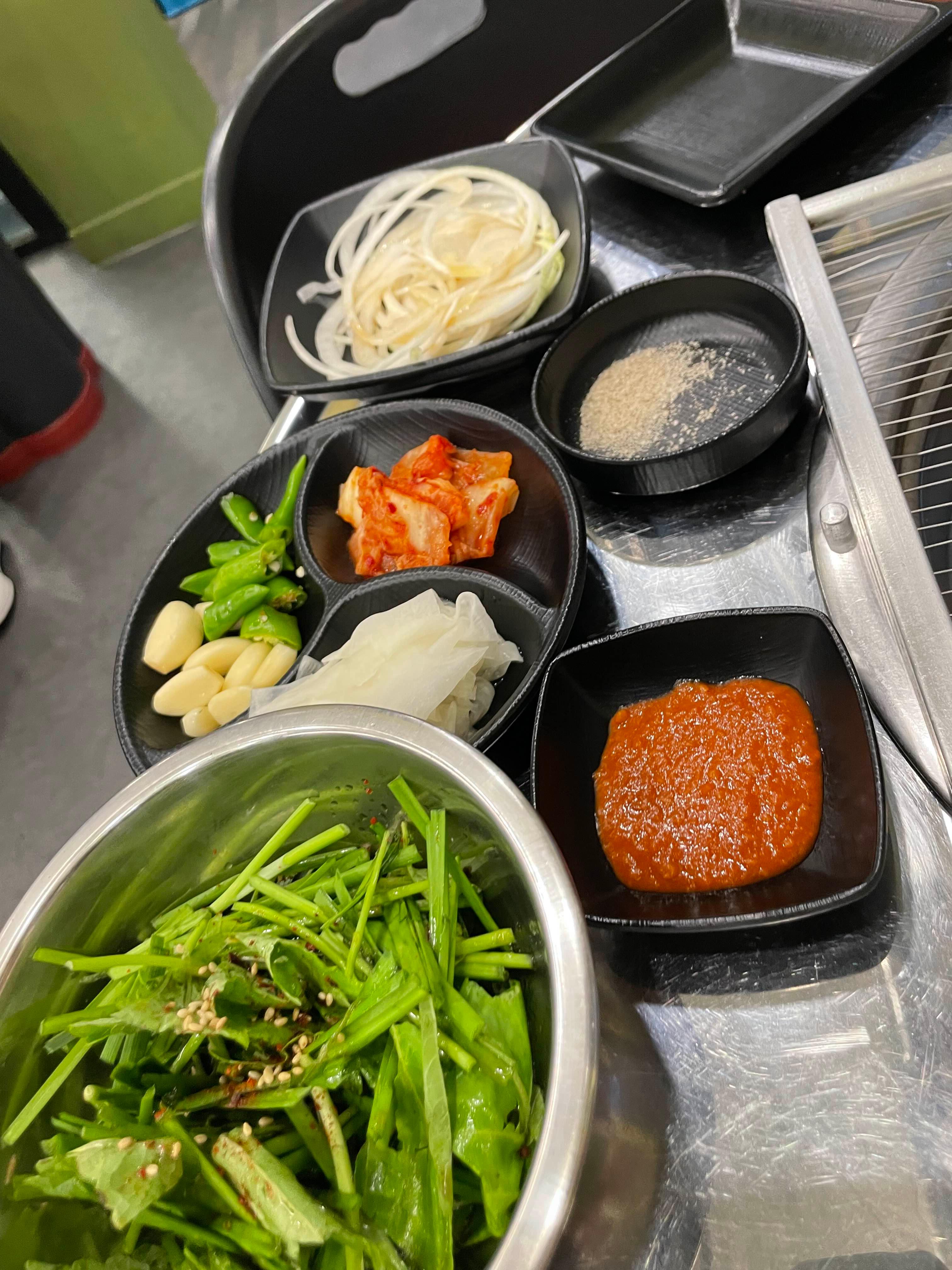 기본 세팅으로 채소양념, 무생채, 배추김치와 양념장이 나오더군요.