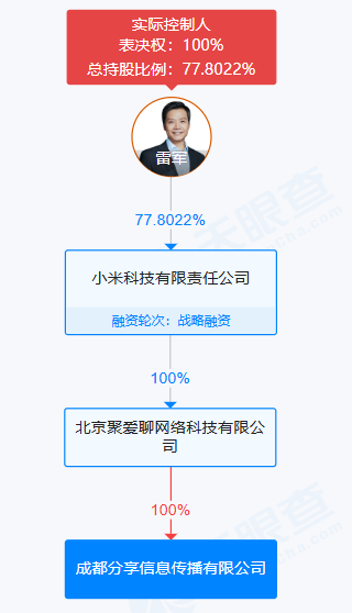 자본 침투 정보에 따르면, 이 회사는 Xiaomi Technology Co., Ltd.가 전액 출자한 Beijing Juai Liao Network Technology Co., Ltd.가 100% 소유하고 있습니다.