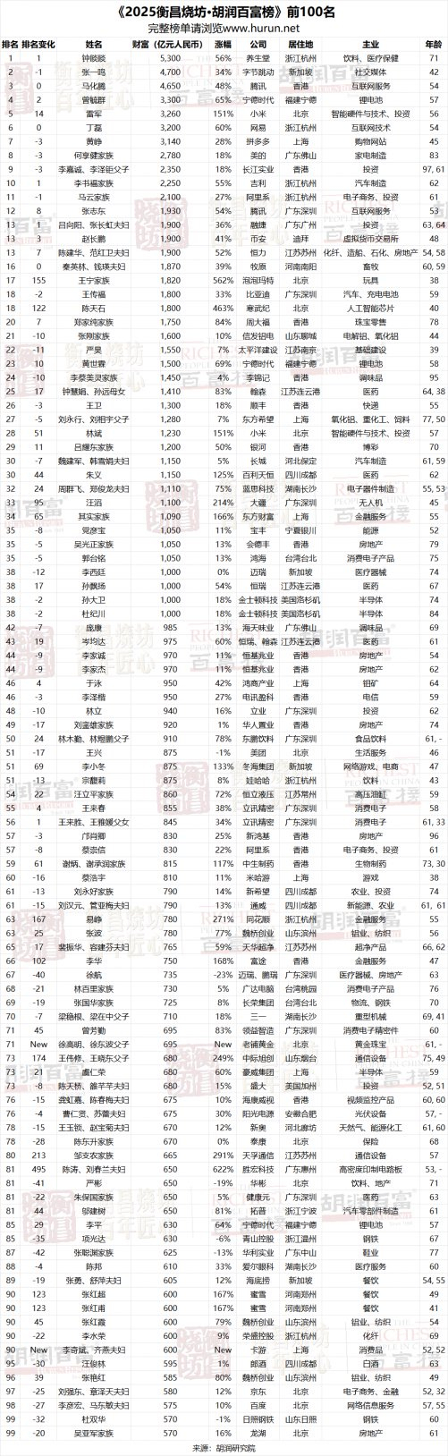 샤오미의 레이쥔은 샤오미 자동차 사업의 폭발적인 성장과 고급 휴대폰 시장 돌파구에 따른 수익 증가에 힘입어 전년 대비 1,960억 위안의 재산 증가를 기록하며 "성장왕"에 등극했습니다. 더 빠른 성장을 보인 기업가로는 팝마트의 왕닝(38세)이 있는데, 라부부의 세계적인 인기에 힘입어 재산이 1,545억 위안 증가했습니다. 캠브리안의 천톈스(40세)는 AI 칩 개발 가속화에 힘입어 실적이 빠르게 성장했습니다. 8월 말, 그의 주가는 한때 마오타이를 넘어섰고, 그의 재산은 1,480억 위안 증가했습니다.