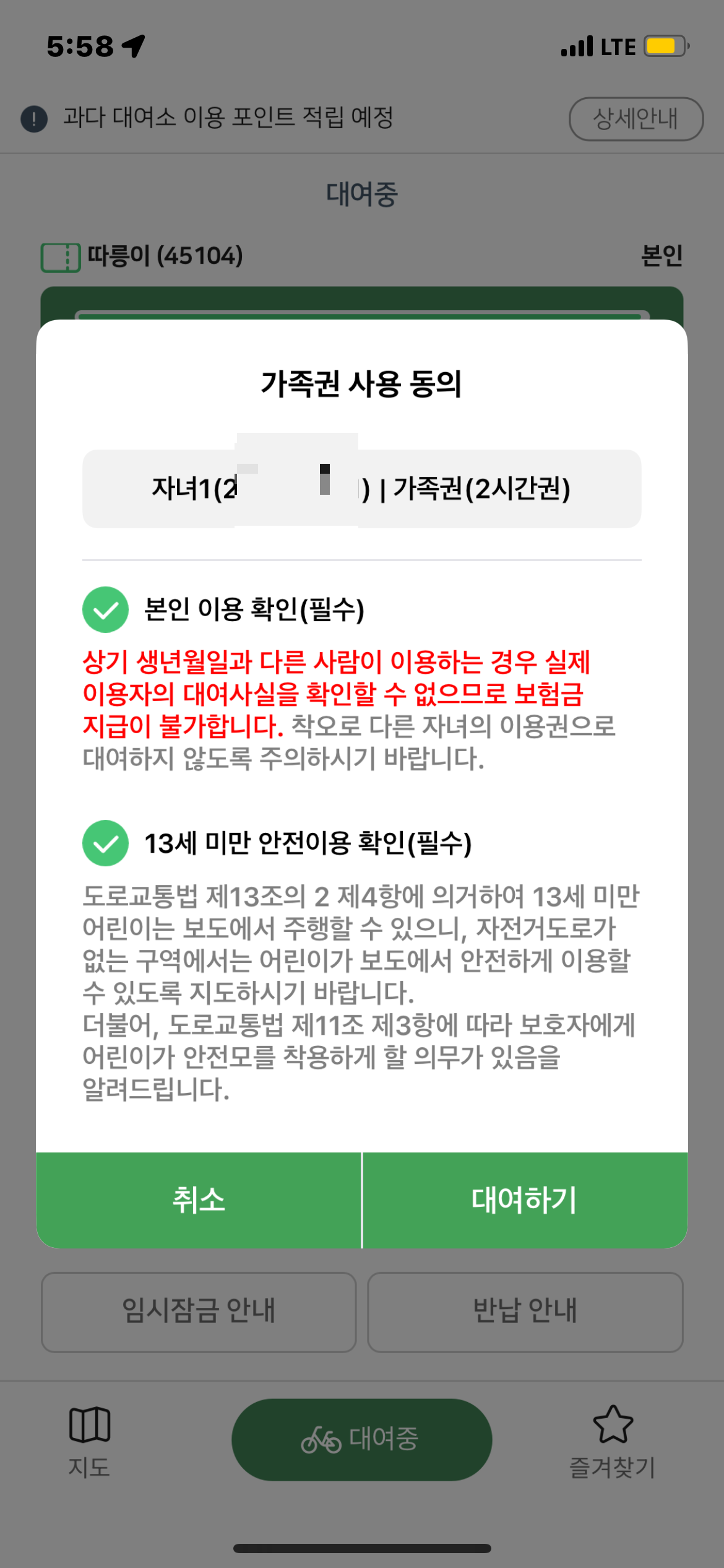 그리고, 따릉이에 다다가 자녀 이용권을 이용하여 대여하고, 내 거를 대여하는데... 오류가 계속 발생한다.