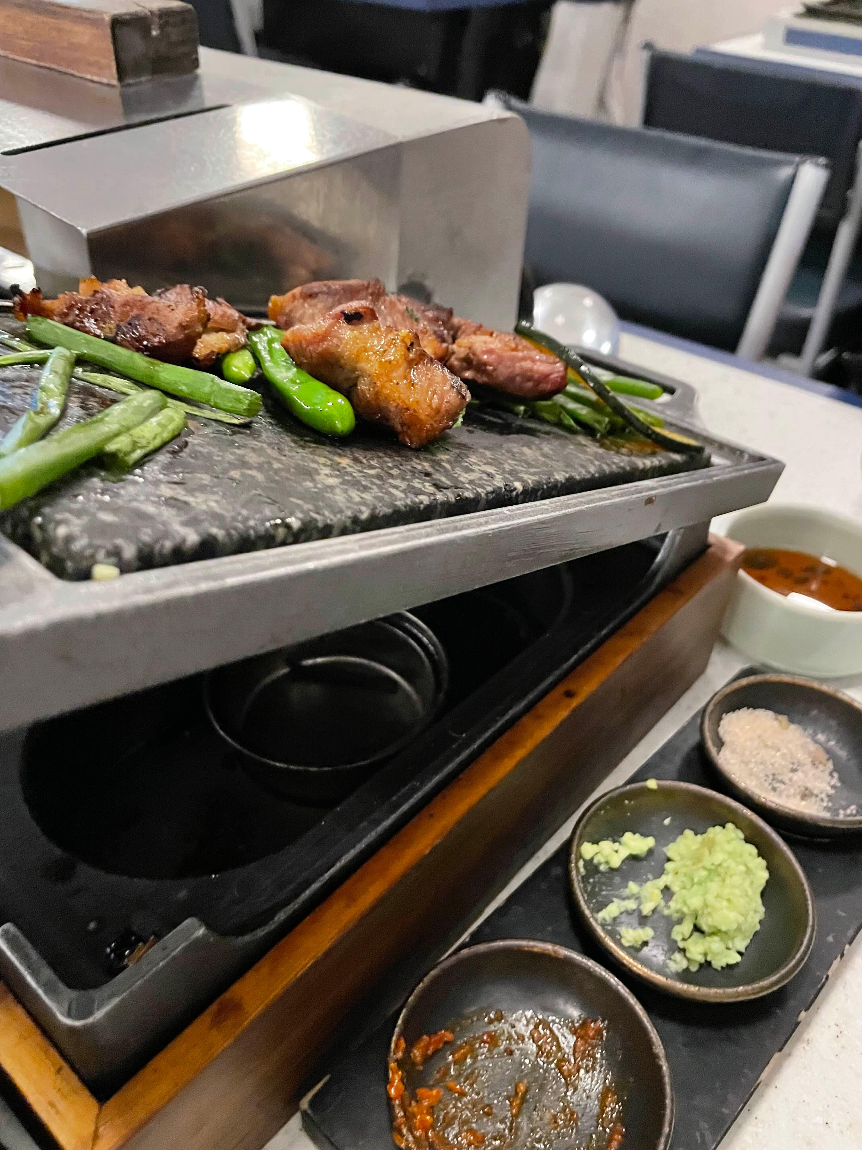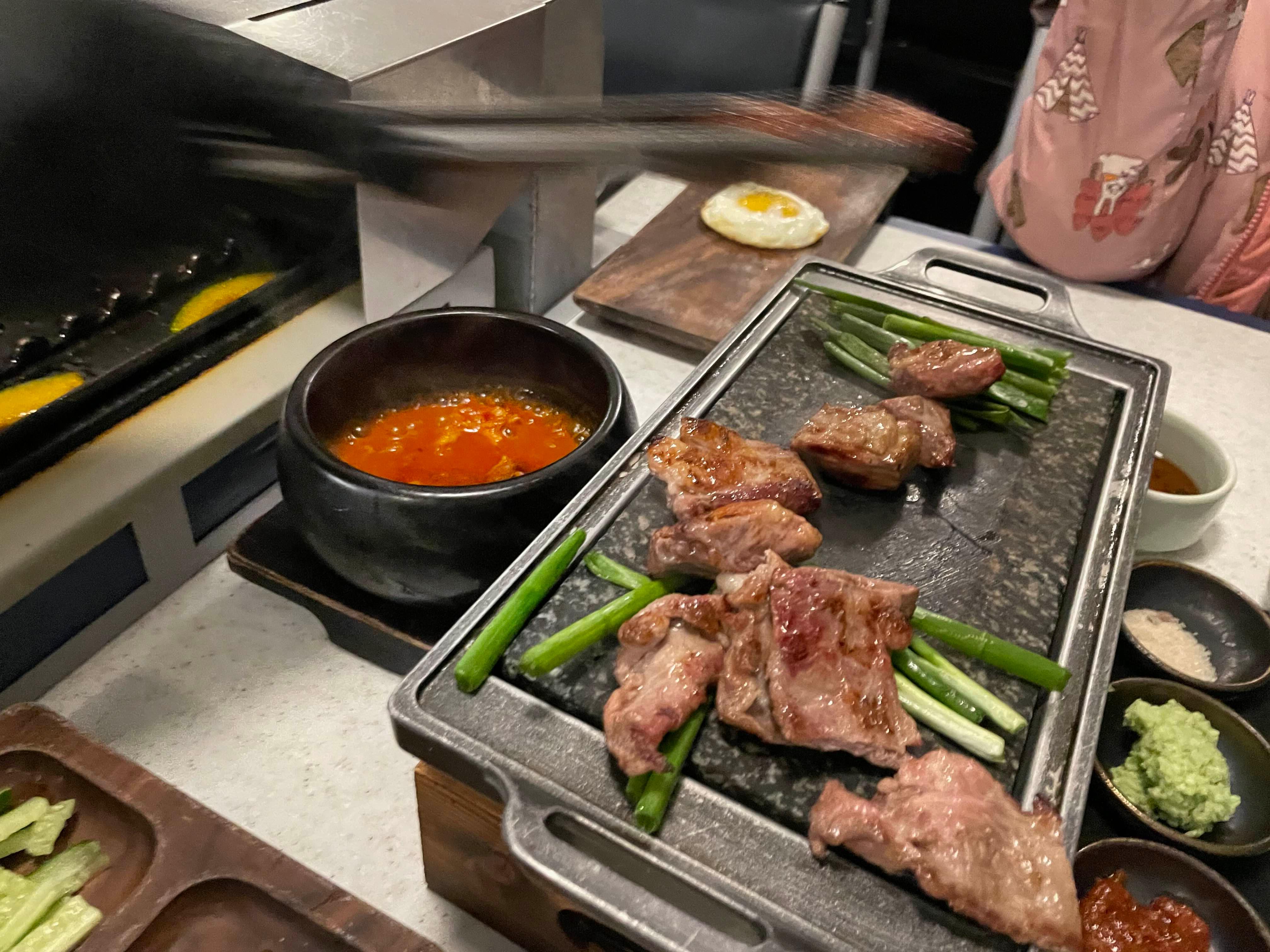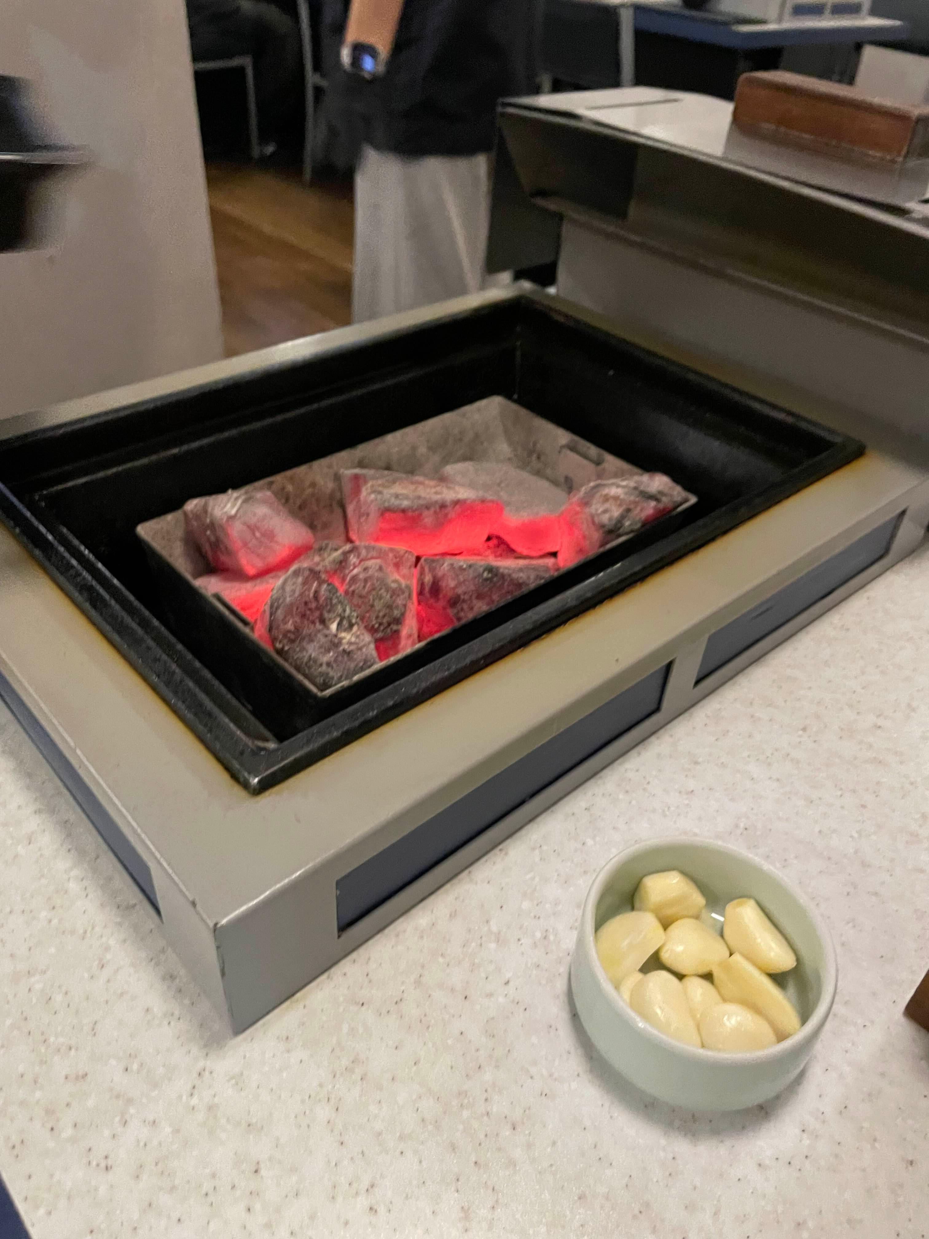 불판이 있고, 그 옆에 조그마한 화로? 고기를 따뜻하게 대펴서 먹는 공간인가 봅니다.