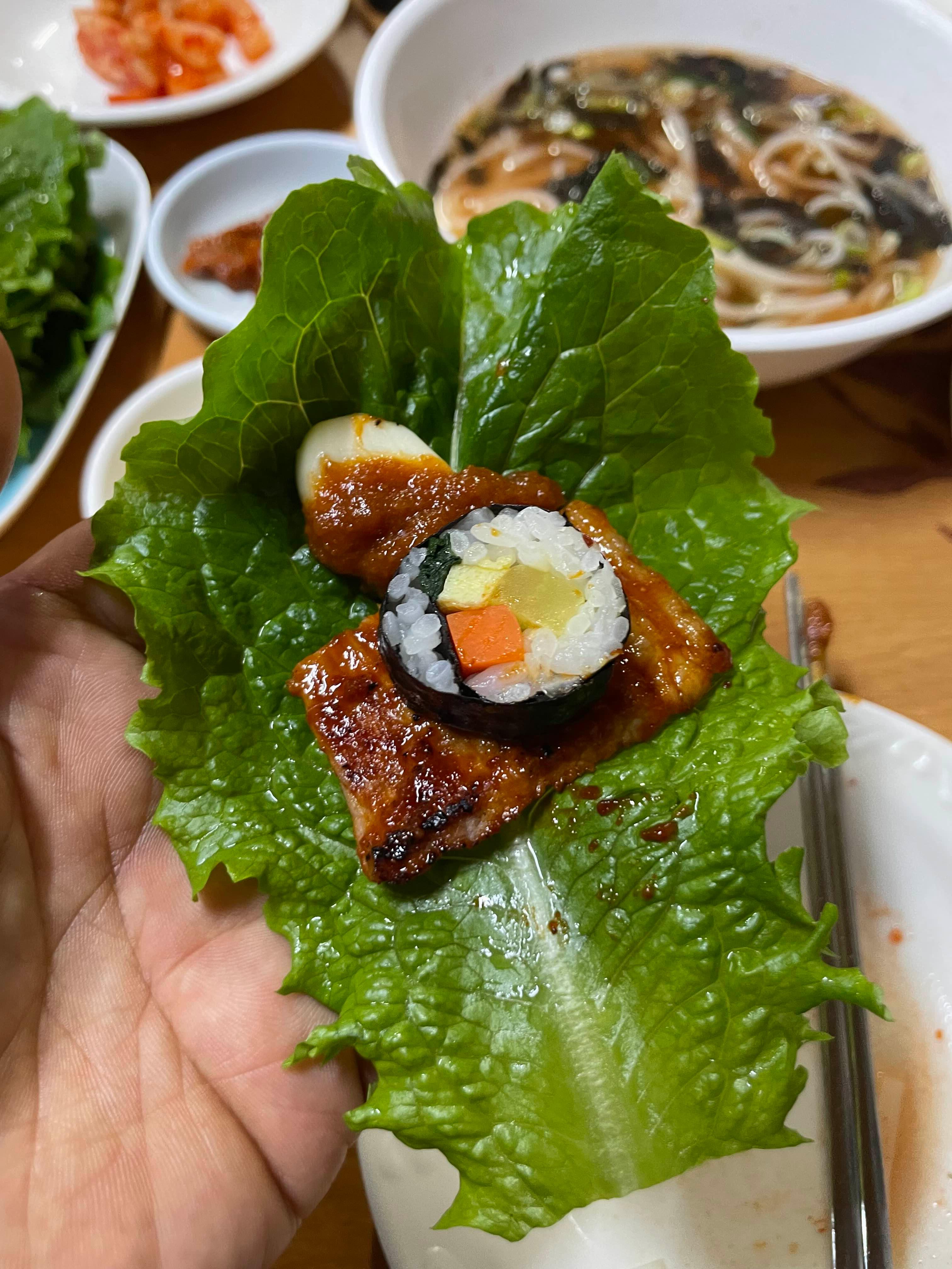 김밥과 불고기를 하나씩 넣어 쌈!!