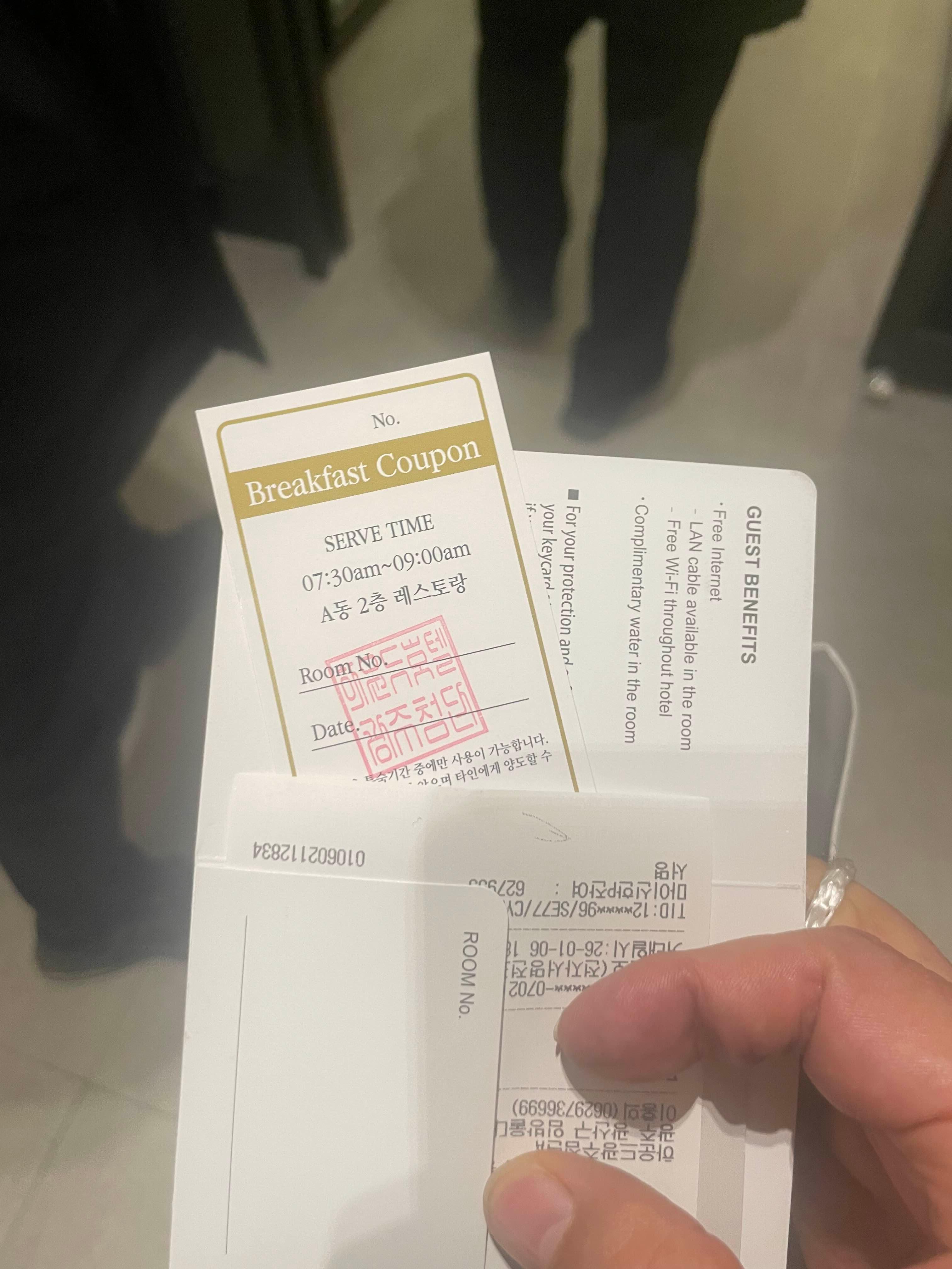 앗!! 체크인하고 키를 받으며, 조식 쿠폰을 주시는데.... 7시 반부터 9시까지 2층에서 제공된다고 한다.