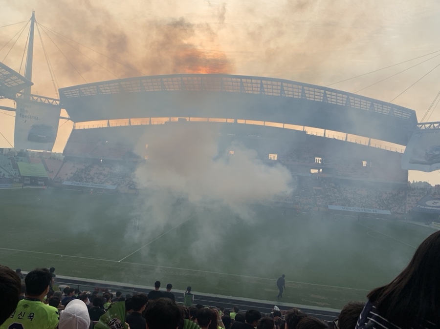 전반전 총평? 수원 삼성 1명 퇴장, 전북 현대 최철순 선수 퇴장.... 최철순 선수는 어떻게 퇴장했는지 아직도 모르겠음;;; 반칙이 이루어 지도 한참 후에 퇴장? 경고 누적이었을까? 암튼 전반에만 2명 퇴장으로 10명 선수로 경기 진행~ 전북 현대 선수들의 집중력이 돋보였던 골이 나왔네요. 고무열 선수, 김승대 선수, 한교원 선수 그리고 이승기 선수의 슛~ 골!!! 그리고 하프타임 이벤트 '오오렐레 폭죽 타임' N석에서는 폭죽은 안 보이고 화약 냄새 타임이었음;;;