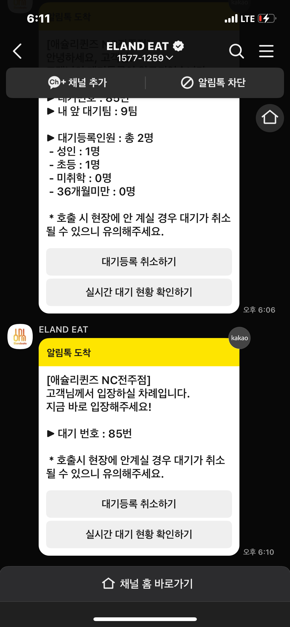 바로, 안내문자가 온다. 입장하란다. 2명이라 2인석 테이블이 바로 나왔나 보다.ㅎㅎ