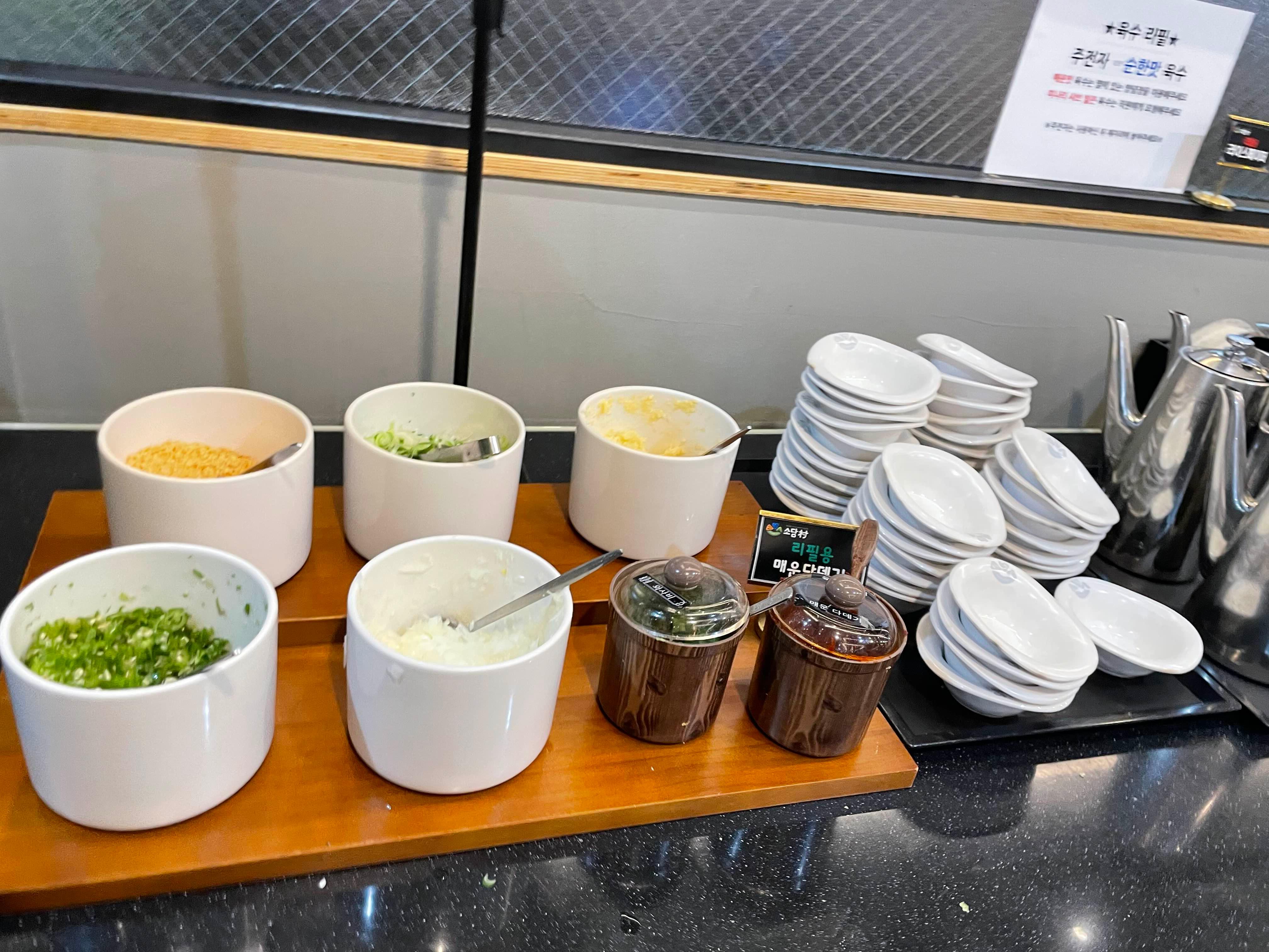 셀프코너에는 다양한 채소와 면, 어묵 등 준비되어 있어서.... 기본만 주문해도 양이 적당할 거 같더군요.