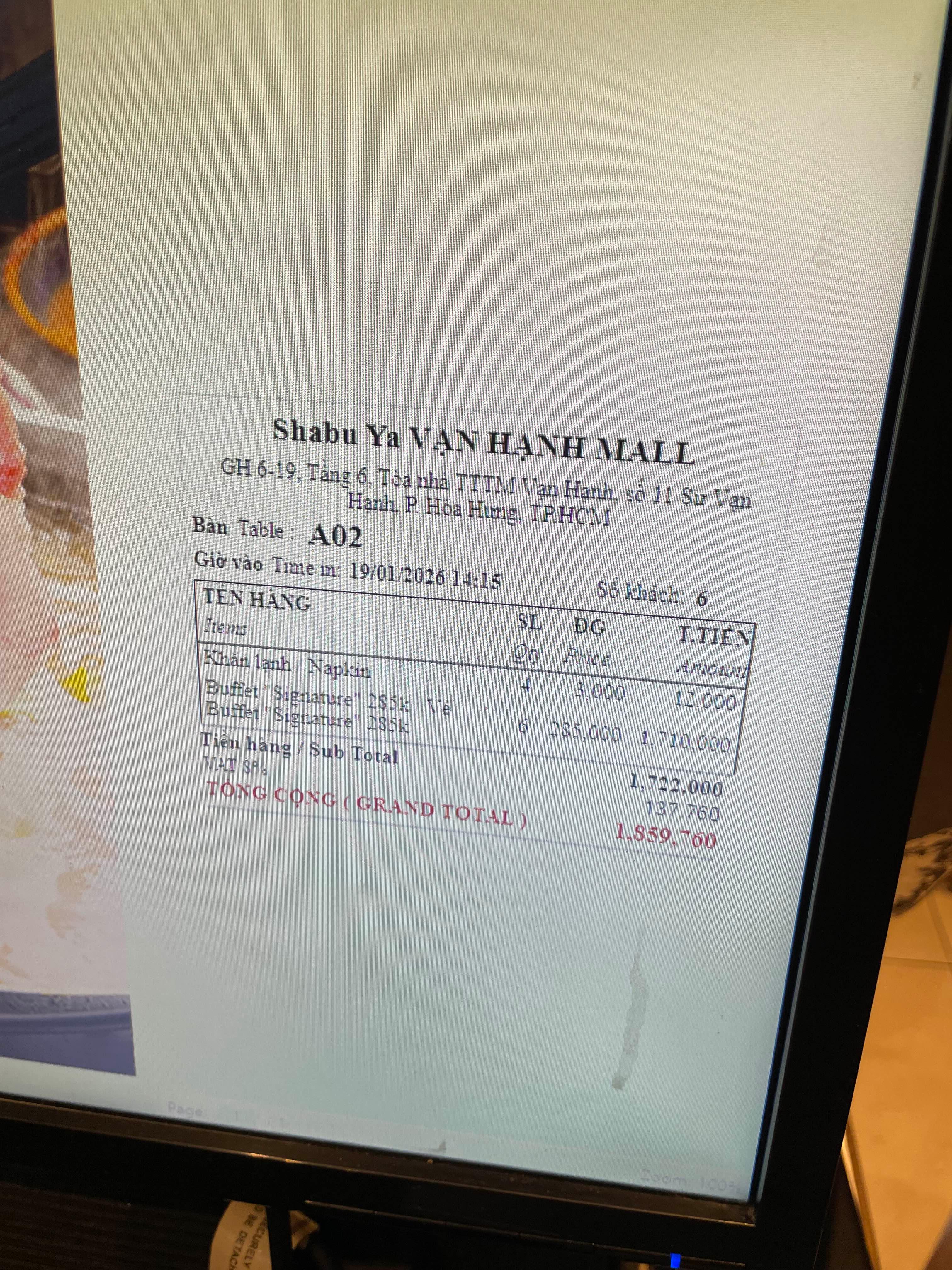 평일 늦은 점심시간에(2시쯤?) 성인 3명, 초등 2명, 중등 1명... 1,859,760동(약 105,000원) 나왔다.