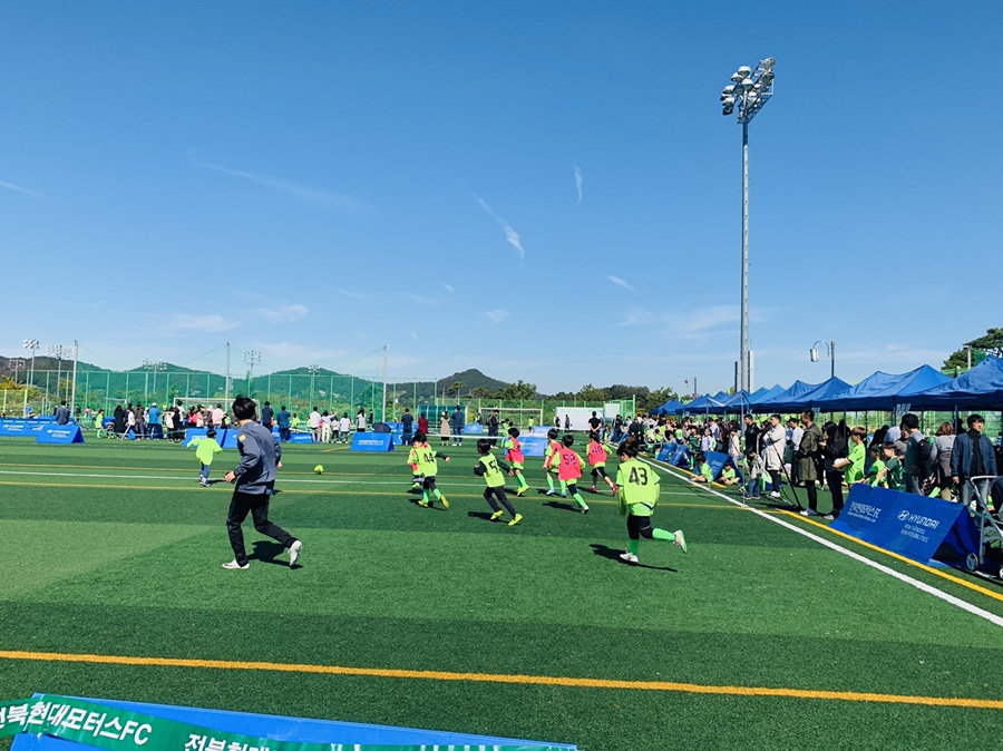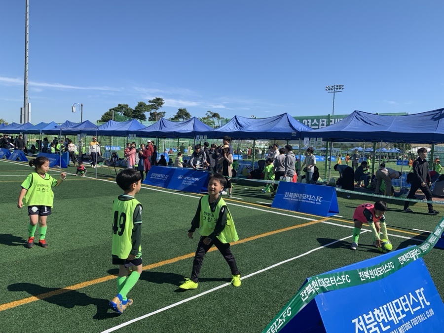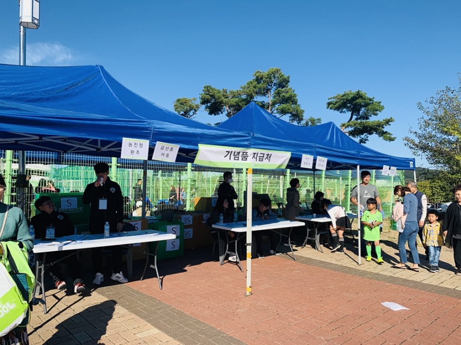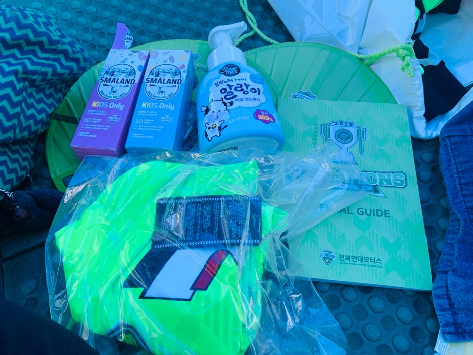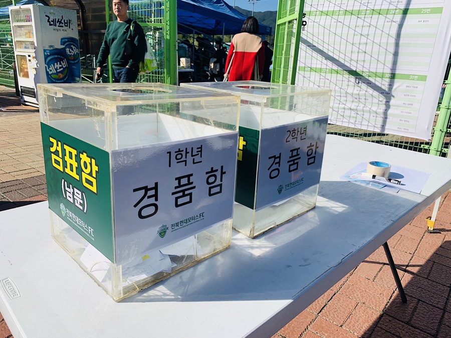 전북 현대 FC 그린스쿨 컵 대회는 그린스쿨 모든 필드의 아이들이 한자리에 모여서 대회를 펼치는 대회입니다. 첫 대회는 2016년에 전주종합운동장에서 진행하였고(아이가 그린스쿨 회원이 아니어서 참석하지 않았음) 2017년부터 완산생활체육공원에서 진행하였네요. 참석하는 아이들에게 다양한 선물을 지급하고(컵 대회가 있는 주에는 그린 스쿨 훈련이 없이 대회로 갈음하여 거의 모든 아이들이 참석하는 경기임), 다른 필드 친구들과 경기하며 친선도모?와 축구를 통해 즐거움을 느끼는 장소입니다. 참고로 2017년은 11월에 경기를 진행하여 너무 추웠는데, 2018년부터 10월에 컵 대회를 진행하여 추위에 떨지 않고 경기를 진행할 수 있었네요. 올해도 어김없이 컵 대회에 도착하여 참가 등록하고 기념품을 수령과 경품 응모권을 경품함에 넣어 경품을 기대하며 경기장에 입장하였습니다.(경품운이 없어 한 번도 당첨은 안 되었음ㅜㅜ)