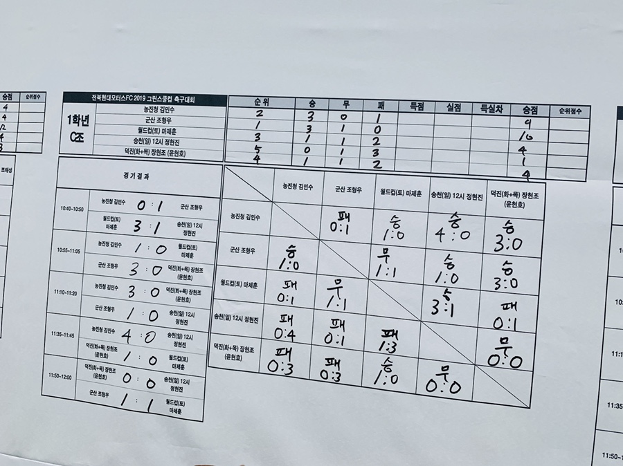 모든 경기를 마치고 아이와 함께 그린스쿨 컵 축구 대회 경기 결과표를 확인해 보았습니다. 1학년 C조에서 군산 필드가 승점 10점으로 1위, 아이가 속해있는 농진청 필드가 승점 9점으로 아쉽게 2위를 했습니다. 농진청 아이들은 작년과 비교했을 때 경기력이 너무 좋아졌더군요. 속해있는 "C"조가 좋았을 수도;; 작년에는 대량 실점으로 대패했던 기억이 나는데, 올해는 3승 1패(8득점 1실점)으로 엄청난 경기력이 향상되었네요. 아이와 컵 대회 참석하기 전 이야기를 나누며 "축구를 오랫동안 안 했고, 컵 대회라서 다른 필드 아이들이 축구를 너무 잘하니 한골 넣기 어려운 거니, 골을 못 넣어도 너무 실망하지 말라"라고 이야기를 나누었습니다. 그런데 아이가 한 골!! 그것도 중거리슛으로 멋지게 한 골을 넣었습니다.