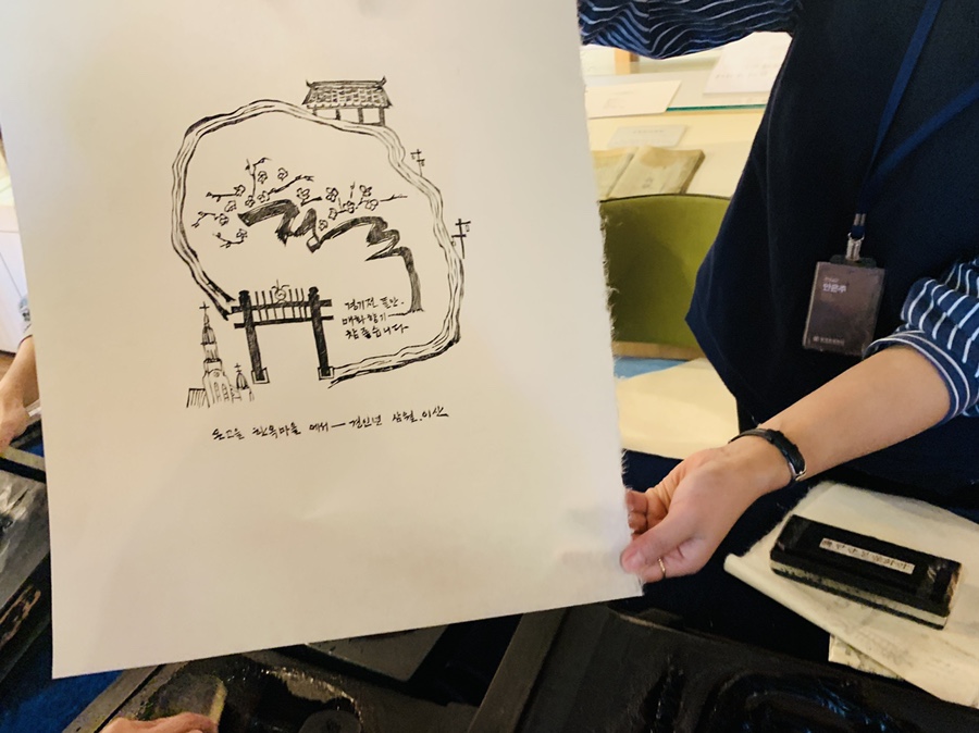 비빔 전설 체험자를 대상으로 한지에 목판인쇄 체험을 할 수 있도록 되어 있습니다. 목판인쇄는 2가지 종류이며 하나는 전주비빔밥이 그려진 목판과 다른 하나는 전주성이 그려진 목판입니다. 큰 아이는 전동성당, 오목대, 풍남민이 그려진 전주성 목판을 골라서 체험을 진행하였습니다. 목판인쇄 체험은 꼭 전주비빔밥 행사기간에만 진행하는 사항이 아닙니다. 완판본문화관에서 체험행사를 진행하는 사항인데..... 전주에 살고 있지만, 처음 들렸던 곳이네요.
