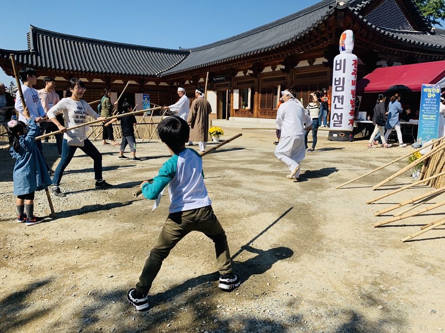 된장 비빔밥을 맛있게 먹고, 2코스로 이동했습니다. 두 번째 유래는 동학농민운동으로 전시상황이니 간이식으로 밥을 비벼 주먹밥으로 먹었다는 내용입니다. 체험은 죽창 체험과 오재미 던지기 체험을 진행하는데, 아이는 죽창 체험을 좋아하더군요. 아이들은 활동적인 죽창을 이용하여 총검술? 비슷하게 몸을 풀어주고 2명씩 짝을지어 대결을 펼치도록 되었습니다. 2번째 코스의 특징은 연극 속에 들어가 있는 느낌이 들었네요. 꼭 연극을 보러 갔는데, 관중을 한 명 뽑아 연극 내 체험시키는 느낌? 이었네요.